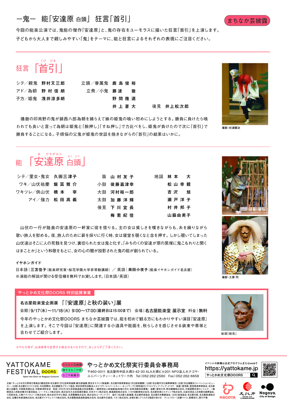 今回の能楽公演では、鬼能の傑作「安達原」と、鬼の存在をユーモラスに描いた狂言「首引」を上演します。子どもから大人まで親しみやすい「鬼」をテーマに、能と狂言によるそれぞれの表現にご注目ください。