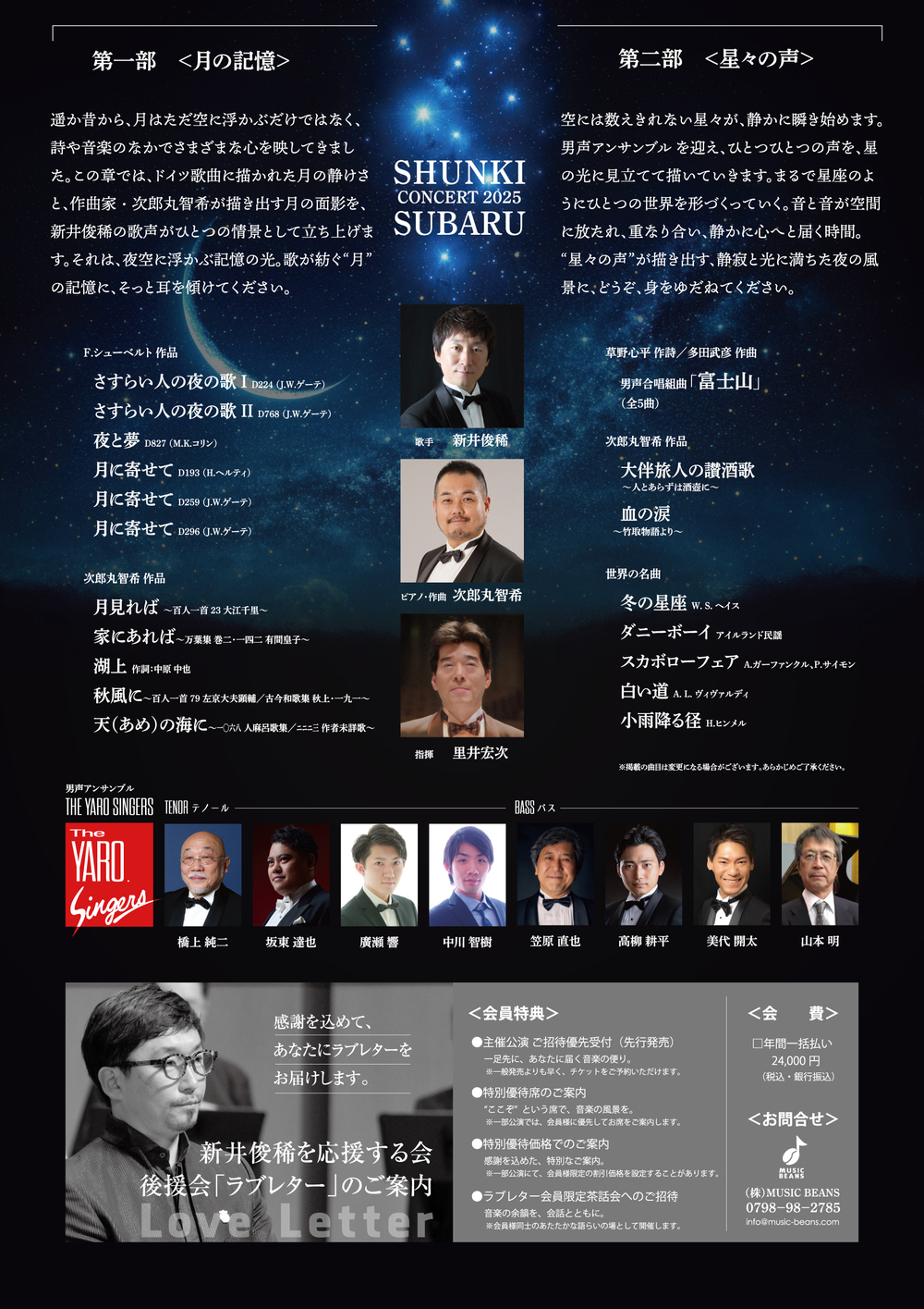 第一部では、月の光に導かれるように静謐(せいひつ)で柔らかな歌の世界を。ドイツ歌曲に描かれた月の静けさと、作曲家・次郎丸智希が描き出す月の面影を、新井俊稀の歌声がひとつの情景として立ち上げます。