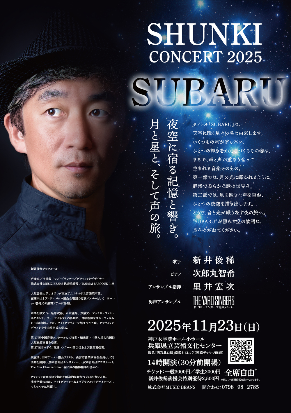 第二部では、星の瞬きに声を重ね、ひとつの夜空を描き出します。男声アンサンブルを迎え、ひとつひとつの声を星の光に見立てて描いていきます。音と光が空間に放たれ、重なり合い、静かに心へと届く時間。どうぞ音と光が織りなす夜の旅へ。「SUBARU」が照らす空の物語に身をゆだねてください。