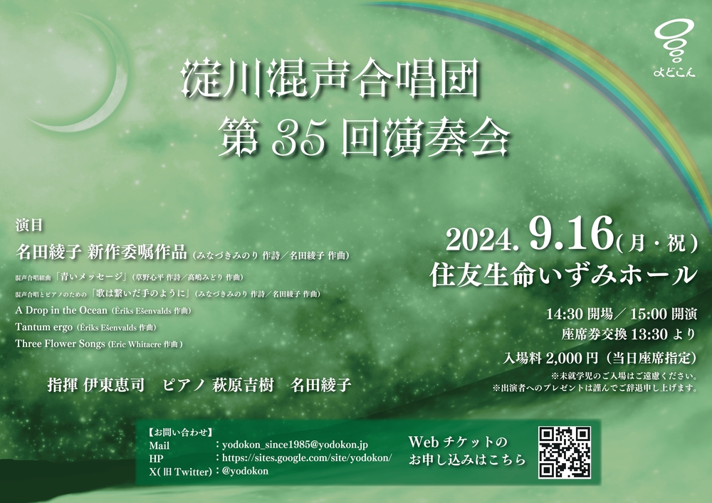 淀川混声合唱団は1985年に結成された、一般の混声合唱団です。 「想像力と仲間」という合唱の本質ともいえるキーワードを大切にしながら、 指揮者・伊東恵司の指導のもと、 日本語・外国語曲にとらわれない新しいレパートリーの開拓をしています。