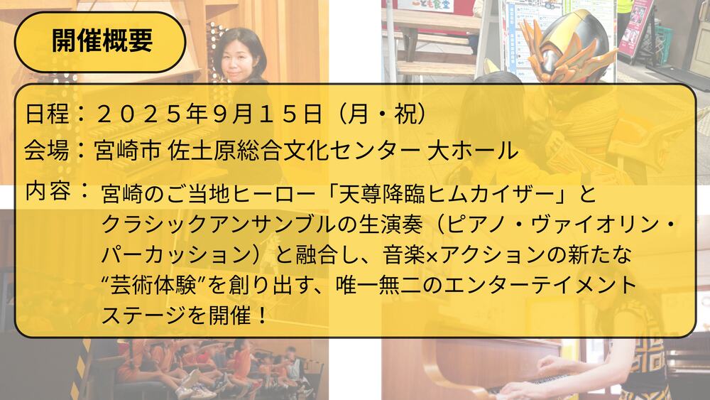 宮崎のヒーロー「天尊降臨ヒムカイザー」とクラシックアンサンブルの生演奏(ピアノ・ヴァイオリン・パーカッション)が融合し『音楽×アクション』の新たな"芸術体験"を創り出す唯一無二のエンターテインメントステージを開催!!