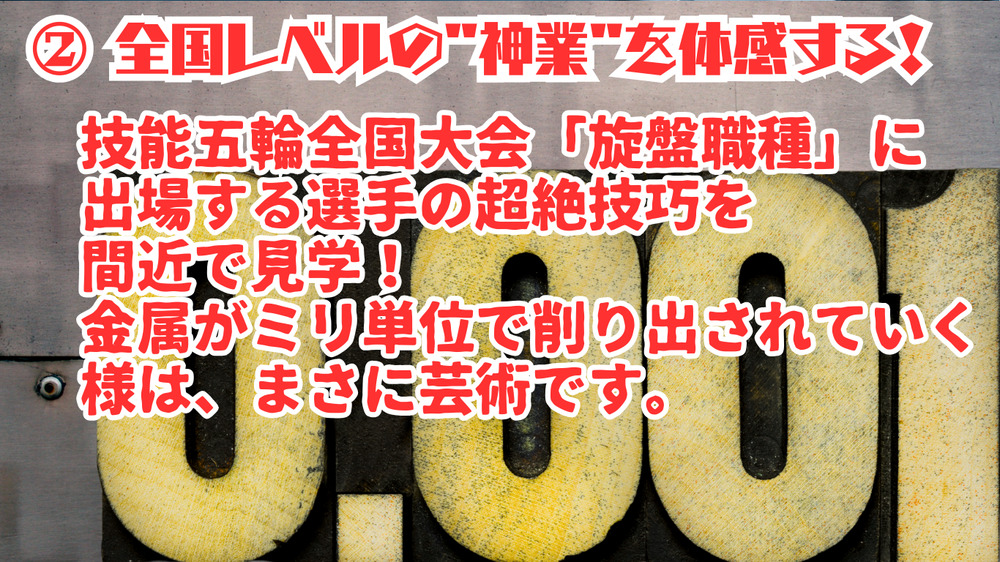 技能五輪全国大会「旋盤職種」に出場する選手の超絶技巧を間近で見学!金属がミリ単位で削り出されていく様は、まさに芸術。日本のものづくりを支えるトップレベルの技術に触れる絶好の機会です。