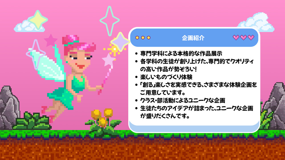 当日は、各学科による本格的な作品展示や、楽しいものづくり体験、クラスや部活動によるユニークな企画をたくさん用意して、皆さんをお待ちしています。
