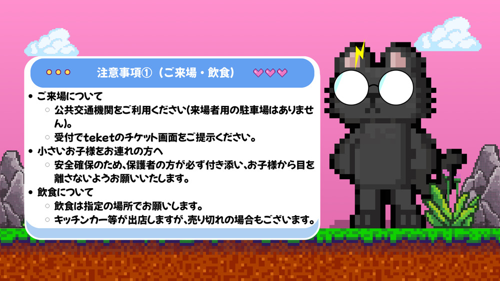 ・キッチンカー等が出店しますが、飲食物は数に限りがあるため、時間によっては売り切れとなる場合がございます。あらかじめご了承ください。