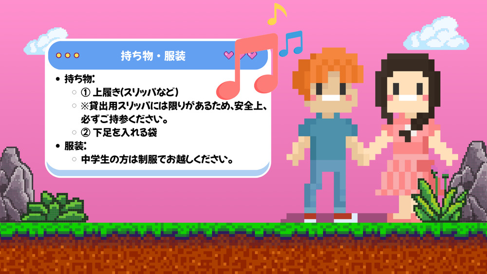 ・上履き(スリッパなど)※お貸しできるスリッパの数に限りがあるため、安全上、必ず上履き等を持参するようお願いします。