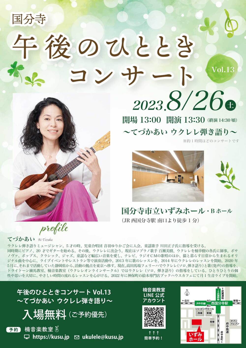 同時期にピアノ、20才でギターを始める。その後、ウクレレに出会う。現在はソプラノ歌手 百瀬美樹、ウクレレを楠幸樹の各氏に師事。ボサノヴァ、ポップス、クラシック、ジャズ、童謡など幅広い音楽を愛し、テレビ、ラジオCMの歌唱のほか、猫と暮らす日常から生まれるオリジナル曲を中心に、ライブイベントやレストラン等で演奏活動中。2013年に歌のレッスンを、2014年にウクレレのレッスンを開始。2020年5月に、それまで活動していた静岡県から、活動の拠点を東京へ移す。現在、高田馬場フェリーハでウクレレ(ソロ、弾き語り)と歌(発声)の指導を、トライトーン練馬教室、楠音楽教室(ウクレレオンラインサークル)ではウクレレ(ソロ、弾き語り)の指導をしている。ひとりひとりの個性や思いを大切に、やさしい時間の流れるレッスンを心がける。2022年に神保町の絵本専門店ブックハウスカフェにて月1生音ライブを開始。