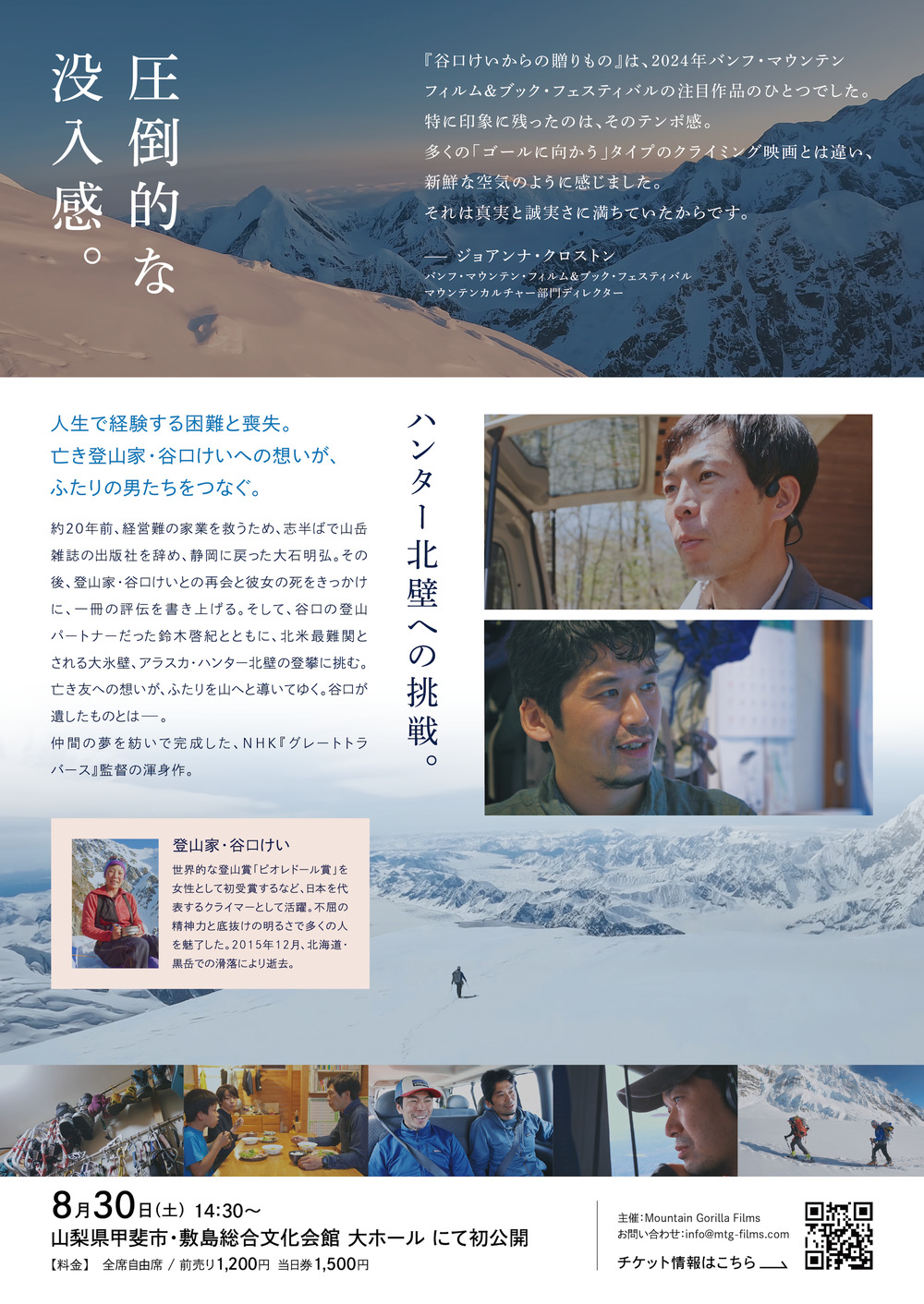 平賀さんのご遺族、そして平賀さんと繋がりのあった方々のご支援とご協力により作品を完成させることができ、昨年はイタリア、カナダなど世界の歴史ある山岳映画祭で上映され、今年9月には韓国のウルサンウルジュ山岳映画祭への出品が決定しています。彼の故郷、山梨で本邦初公開したいと考え、この度上映会を企画しました。