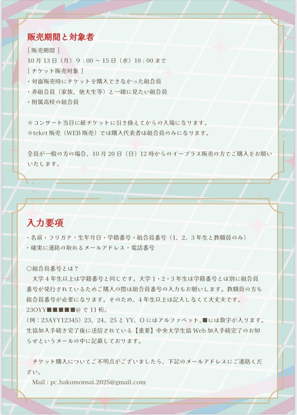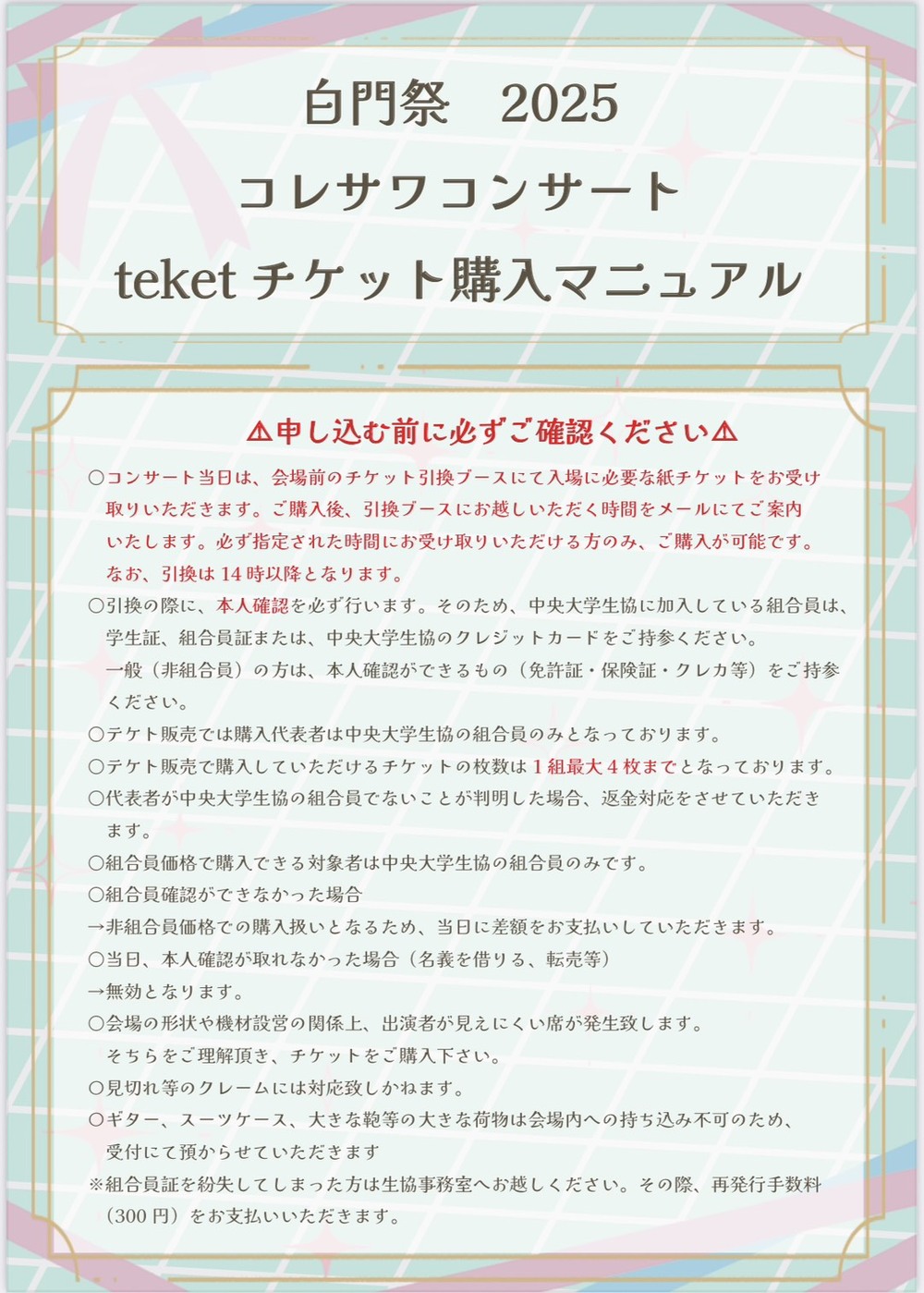 ※テケト販売では購入代表者は中央大学の組合員のみとなっております。
