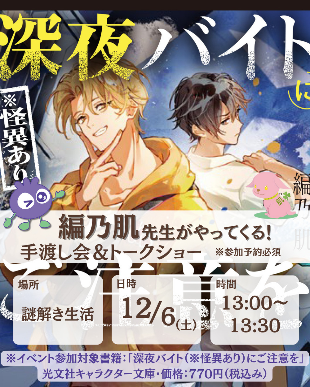 当日レジカウンターにて対象書籍『深夜バイト(※怪異あり)にご注意を』をご購入いただいたお客様がイベント参加可能になります。