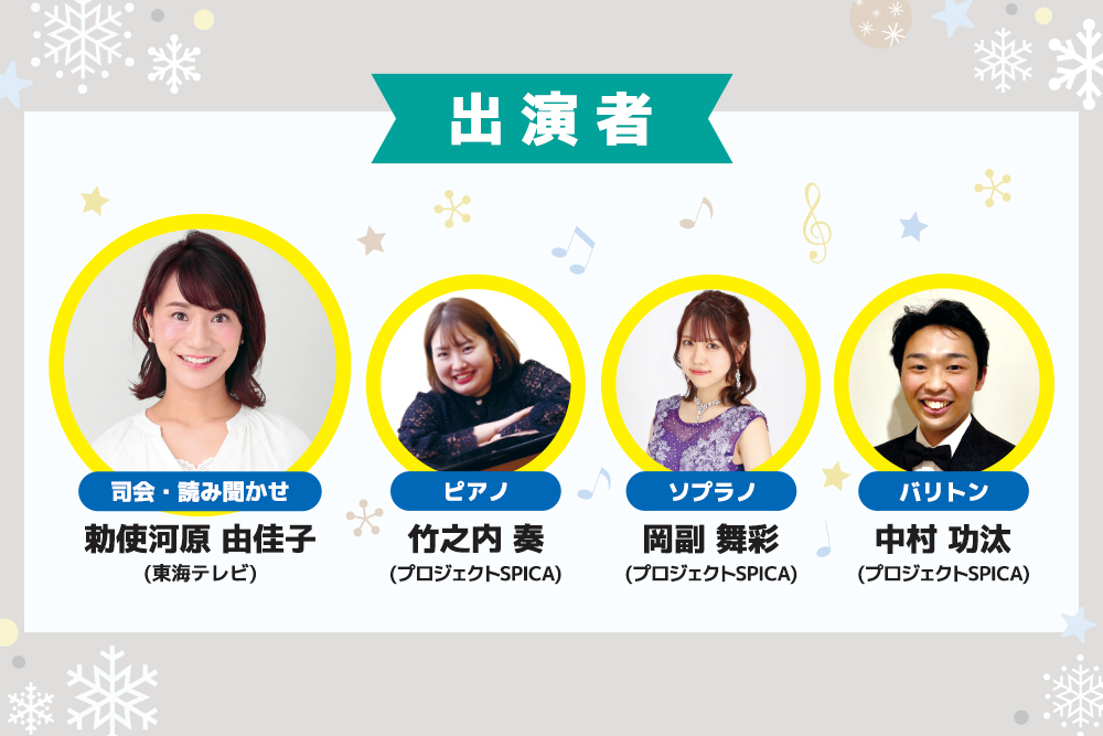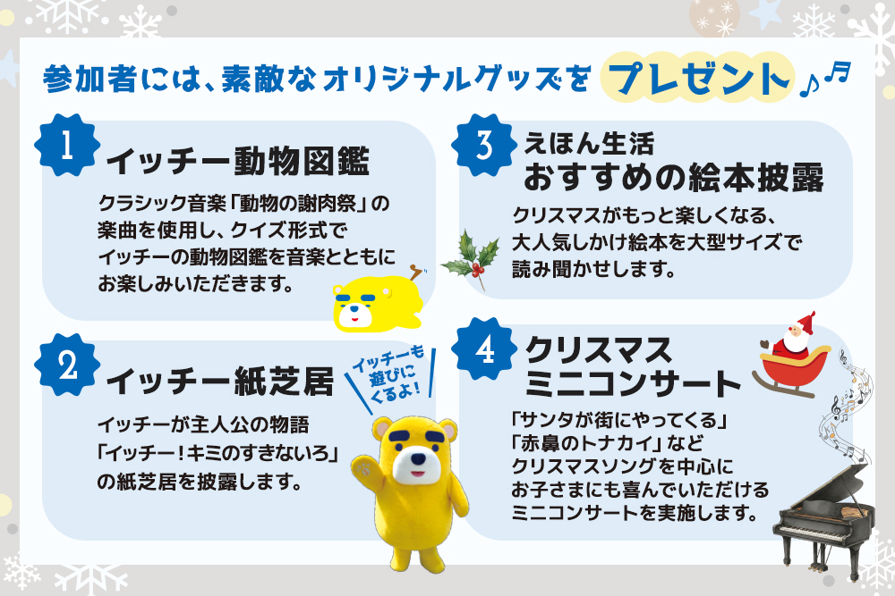 「サンタが街にやってくる」「赤鼻のトナカイ」などクリスマスソングを中心にお子さまにも喜んでいただける ミニコンサートを実施します。