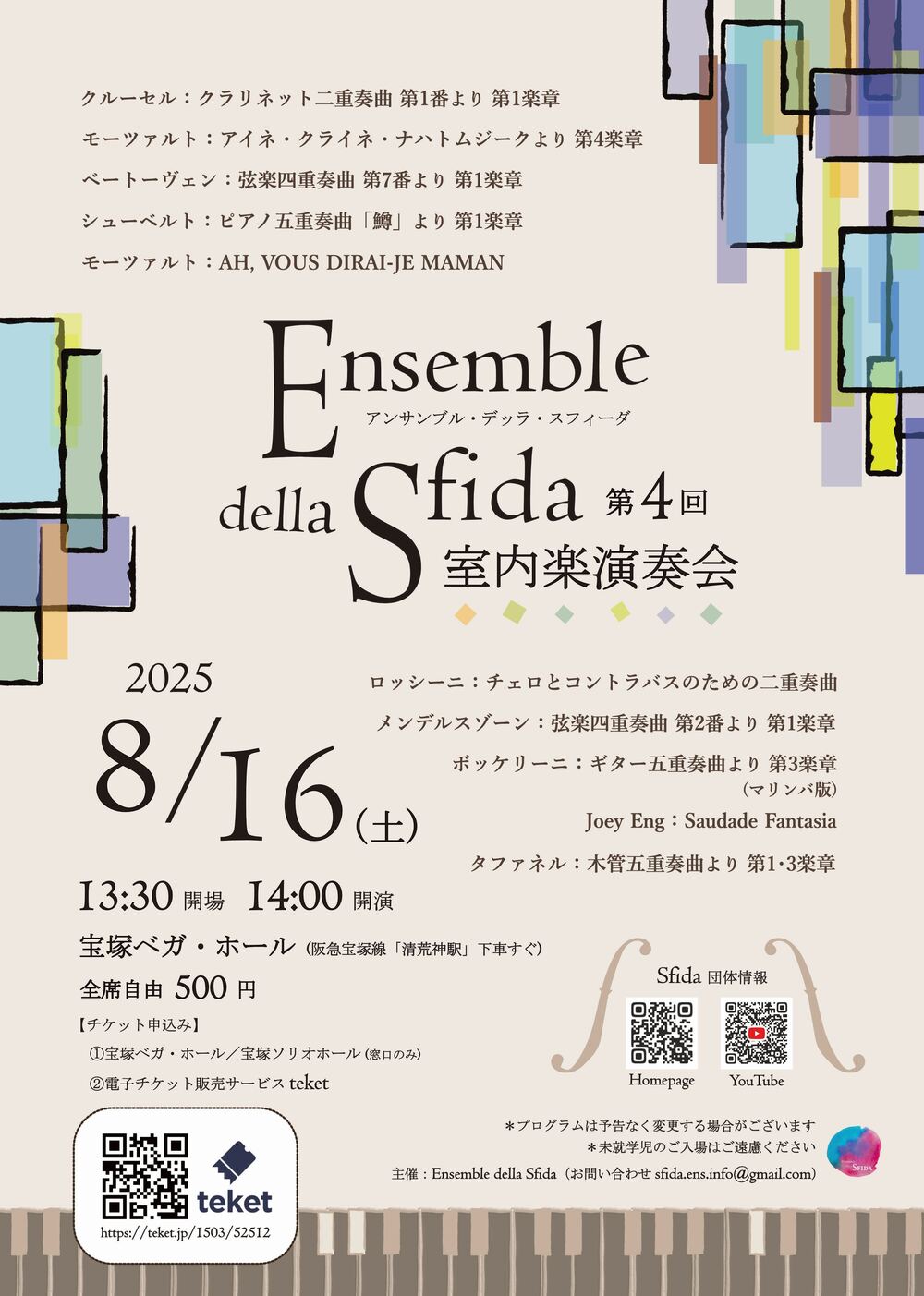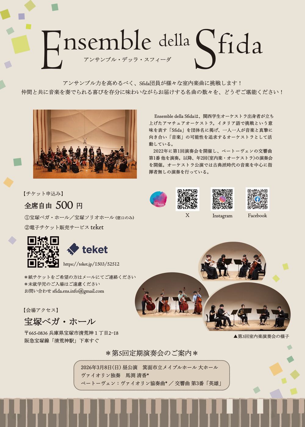 アンサンブル力を高めるべく、Sfida団員が様々な室内楽曲に挑戦します!仲間と共に音楽を奏でられる喜びを存分に味わいながらお届けする名曲の数々を、どうぞご堪能ください!