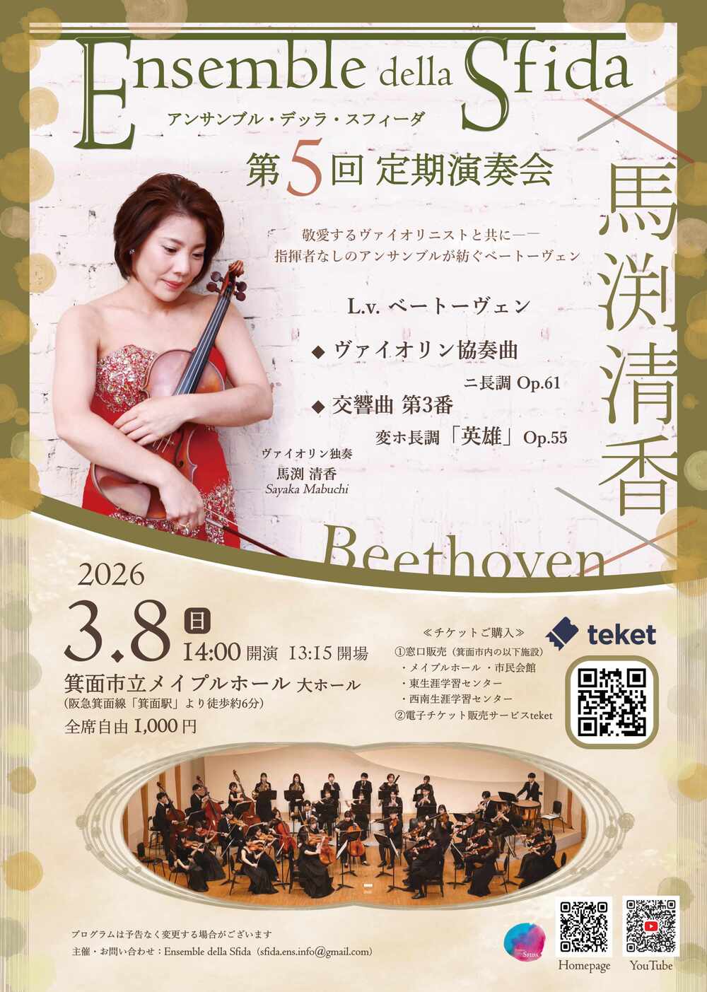 今回はオールベートーヴェンプログラム。関西を中心に大活躍されているヴァイオリニスト馬渕清香氏を迎えた協奏曲と、器楽音楽による表現の新たな可能性の扉を開いた画期的な作品、交響曲第3番「英雄」をお届けします。