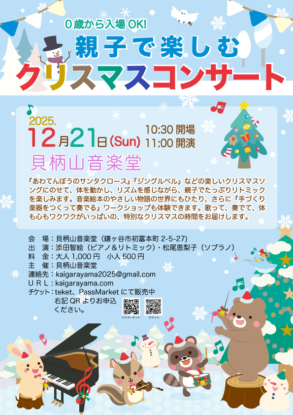 『あわてんぼうのサンタクロース』『ジングルベル』などの楽しいクリスマスソングにのせて、体を動かし、リズムを感じながら、親子でたっぷりリトミックを楽しみます。音楽絵本のやさしい物語の世界にもひたり、さらに『手づくり楽器をつくって奏でる』ワークショップも体験できます。歌って、奏でて、体も心もワクワクがいっぱいの、特別なクリスマスの時間をお届けします。」
