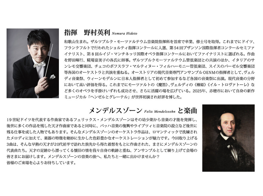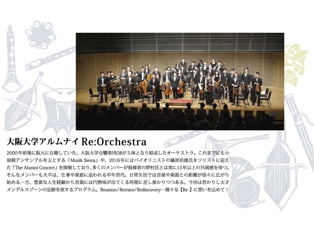 これまでにも小規模アンサンブルを主とする「Musik Siesta」や、2016年にはヴァイオリニストの藤原浜雄氏をソリストに迎えた「The Alumni Concert」を開催しており、多くのメンバーが指揮者の野村氏と15年以上の共演歴を有する。