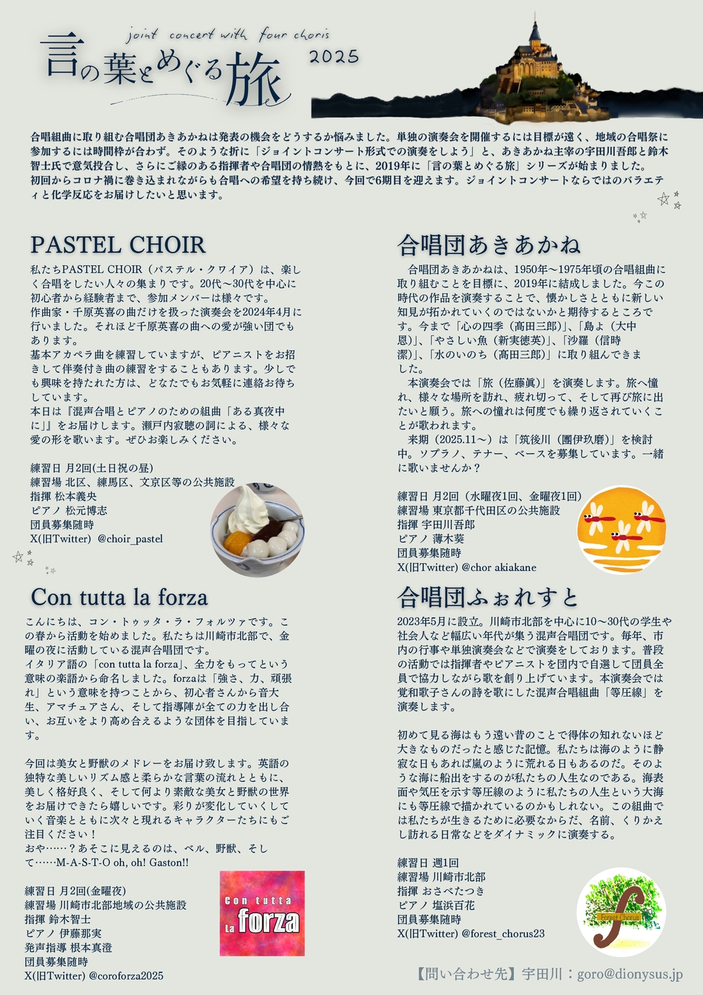 合唱組曲に取り組む合唱団あきあかねは発表の機会をどうするか悩みました。単独の演奏会を開催するには目標が遠く、地域の合唱祭に参加するには時間枠が合わず。そのような折に「ジョイントコンサート形式での演奏をしよう」と、あきあかね主宰の宇田川吾郎と鈴木智士氏で意気投合し、さらにご縁のある指揮者や合唱団の情熱をもとに、2019年に「言の葉とめぐる旅」シリーズが始まりました。初回からコロナ禍に巻き込まれながらも合唱への希望を持ち続け、今回で6期目を迎えます。ジョイントコンサートならではのバラエテイと化学反応をお届けしたいと思います。