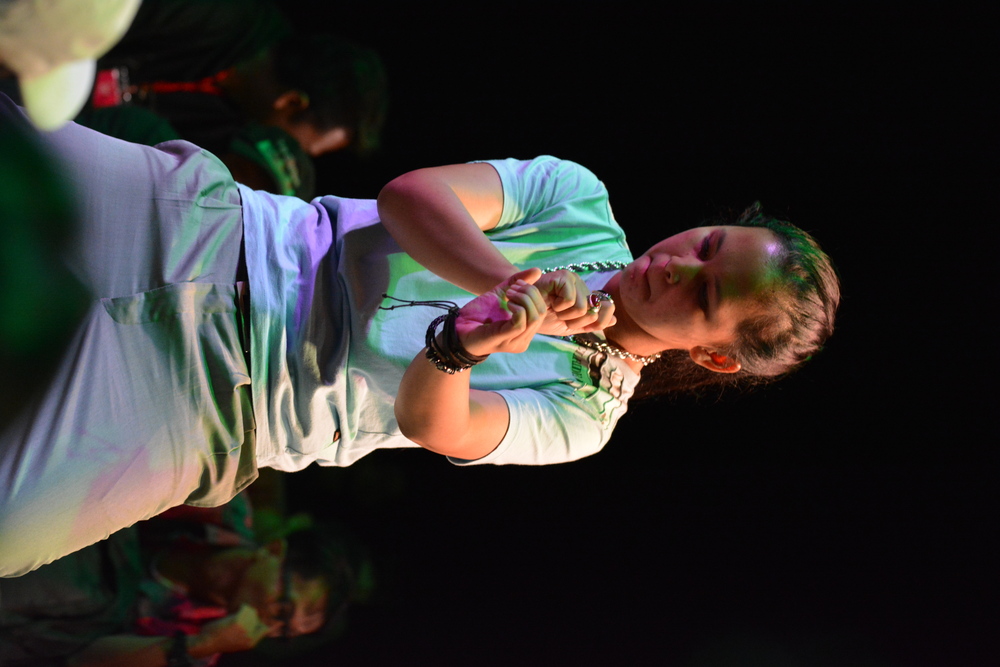 「ダンドゥット」はインドやマレー、アラブ、などの音楽が融合した、インドネシアで広く親しまれている大衆音楽のジャンルです。その歌い手の多くは若い女性であり、男性観客はそのリズムに合わせて身体を揺らします。アユ・プルマタ・サリは、「ダンドゥット」を楽しむ男性観客の身体の動きやグルーヴに着目し、再現することでパフォーマーと観客の視線を逆転させます。