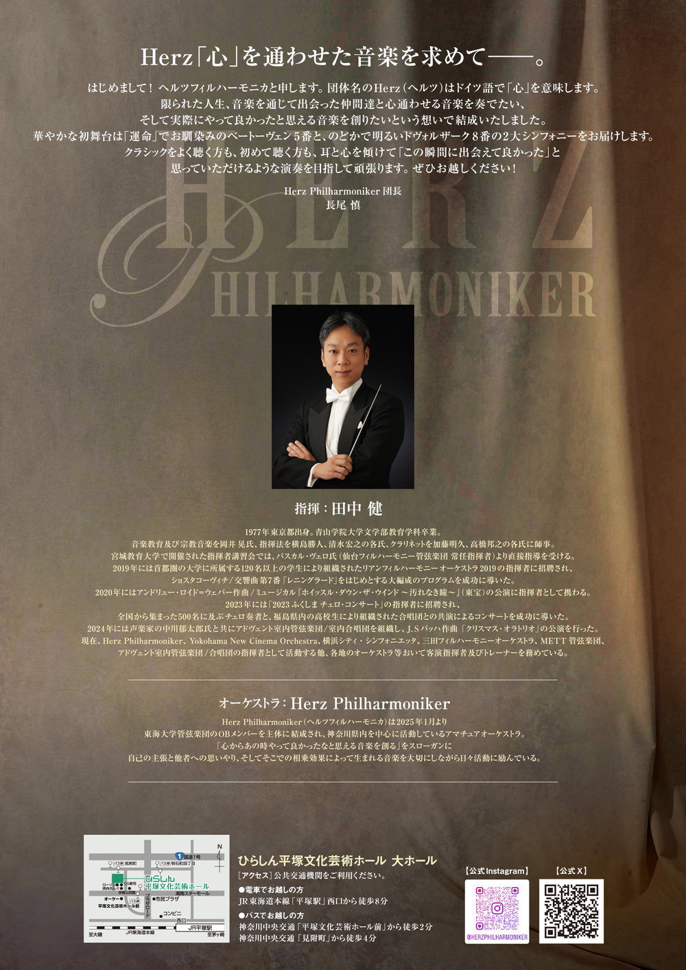 Herz Philharmoniker(ヘルツフィルハーモニカ)は2025年1月より東海大学管弦楽団のOBメンバーを主体に結成され、神奈川県内を中心に活動しているアマチュアオーケストラ。 「心からあの時やって良かったなと思える音楽を創る」をスローガンに自己の主張と他者への思いやり、そしてそこでの相乗効果によって生まれる音楽を大切にしながら日々活動に励んでいる。