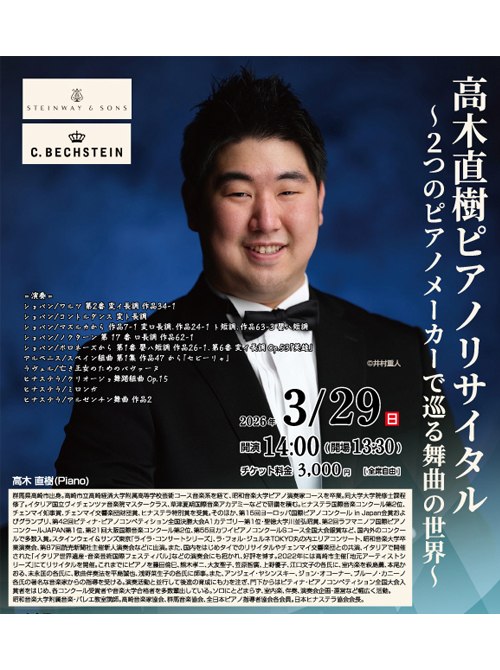2つのピアノメーカー、「スタインウェイ」と「ベヒシュタイン」ピアノを使用。その音色の特性を生かした魅力的な舞曲の演奏をお楽しみください♪