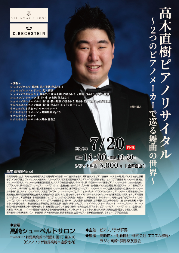2つのピアノメーカー、「スタインウェイ」と「ベヒシュタイン」ピアノを使用。その音色の特性を生かした魅力的な舞曲の演奏をお楽しみください♪