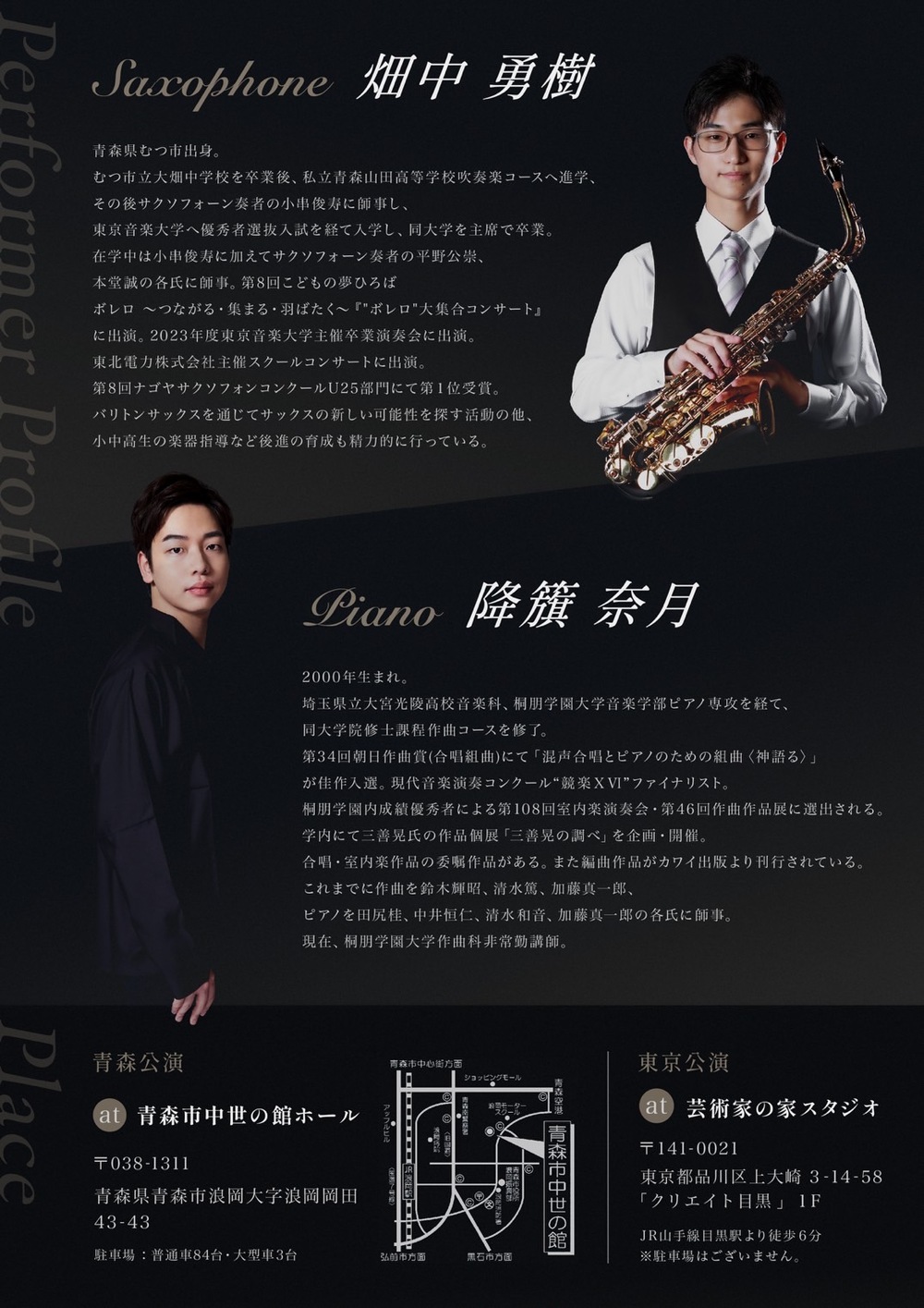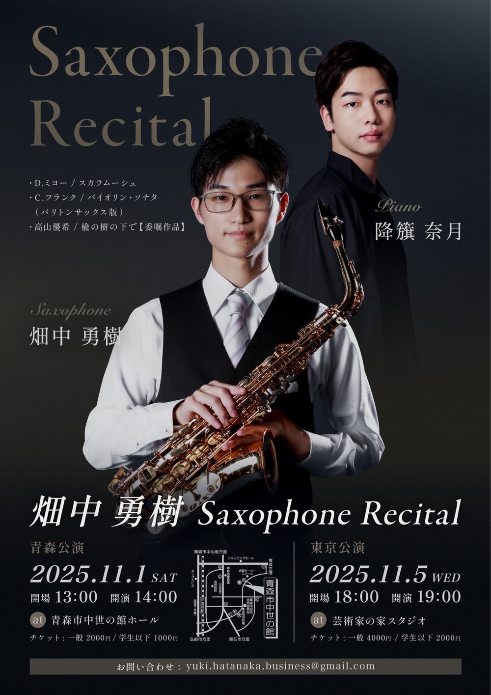 サクソフォンのクラシックレパートリーや今回初演の楽曲、またバリトンサックスの音色で聴くヴァイオリン三大ソナタのひとつ、セザール・フランクのヴァイオリンソナタなど沢山のみどころ、聞きどころがございます。
