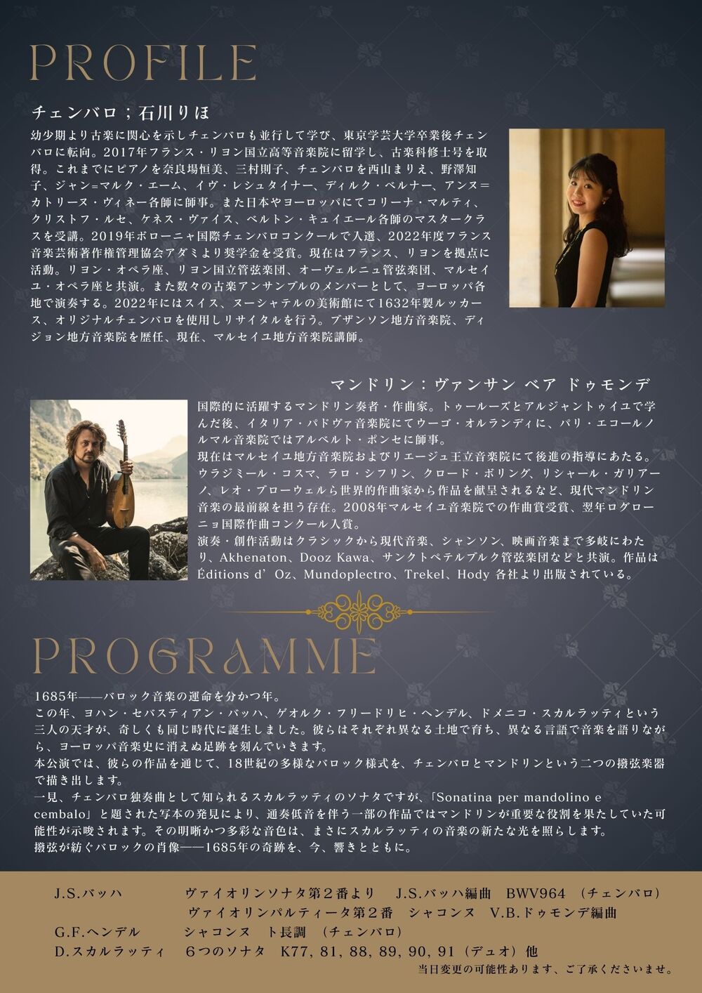 本公演では、彼らの作品を通じて、18世紀の多様なバロック様式を、チェンバロとマンドリンという二つの撥弦楽器で描き出します。