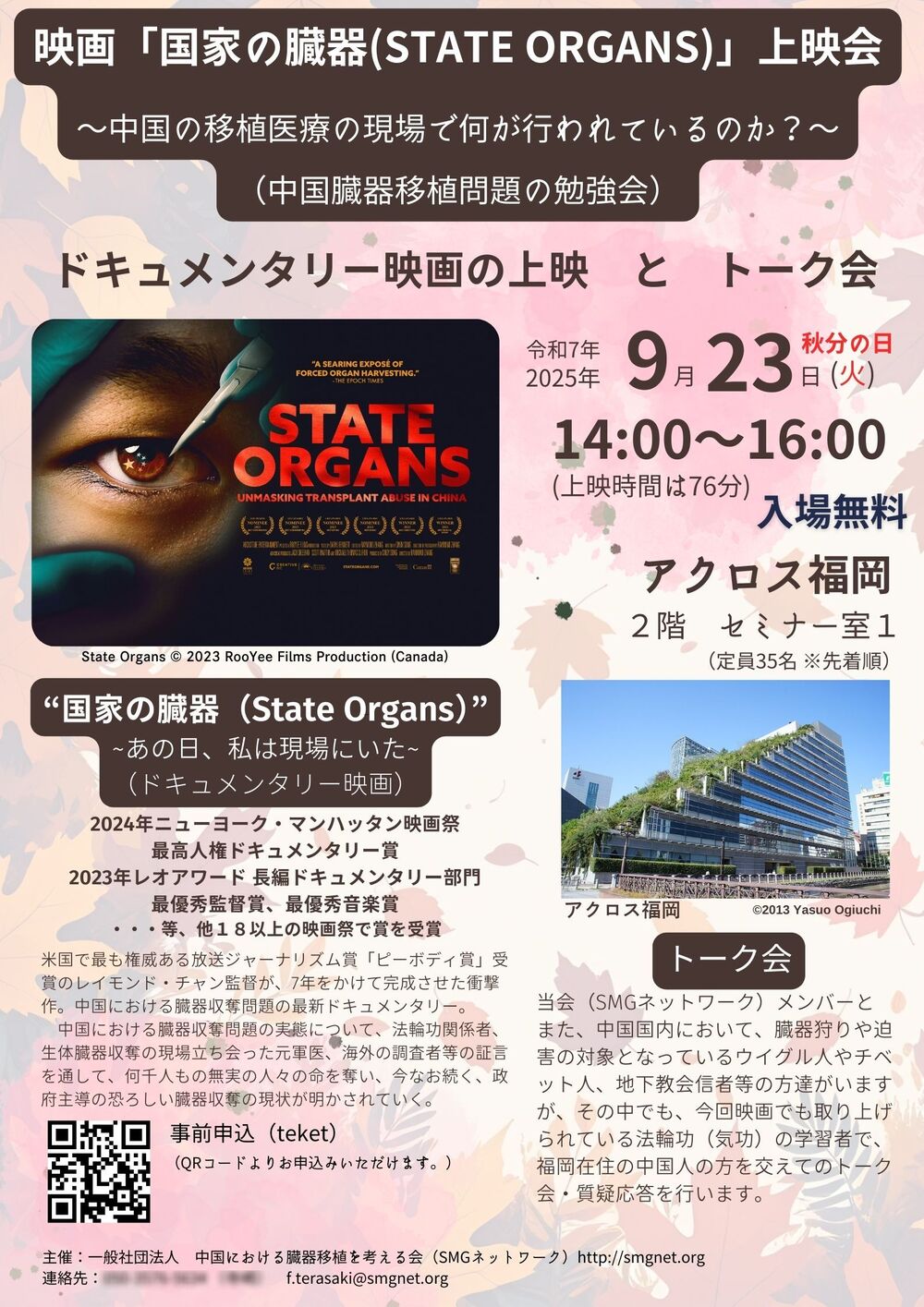 勉強会では、映画「ステート・オーガン(State Organs)(75分)」(2024カナダ)の上映と、弊会メンバー・関係者によるトーク会を実施し、当問題について現在の国際社会での取り組みに等について紹介しつつ、参加者の皆さんと一緒に、当問題についてどう向き合っていくべきか、取り組んでいくべきかを考えます。