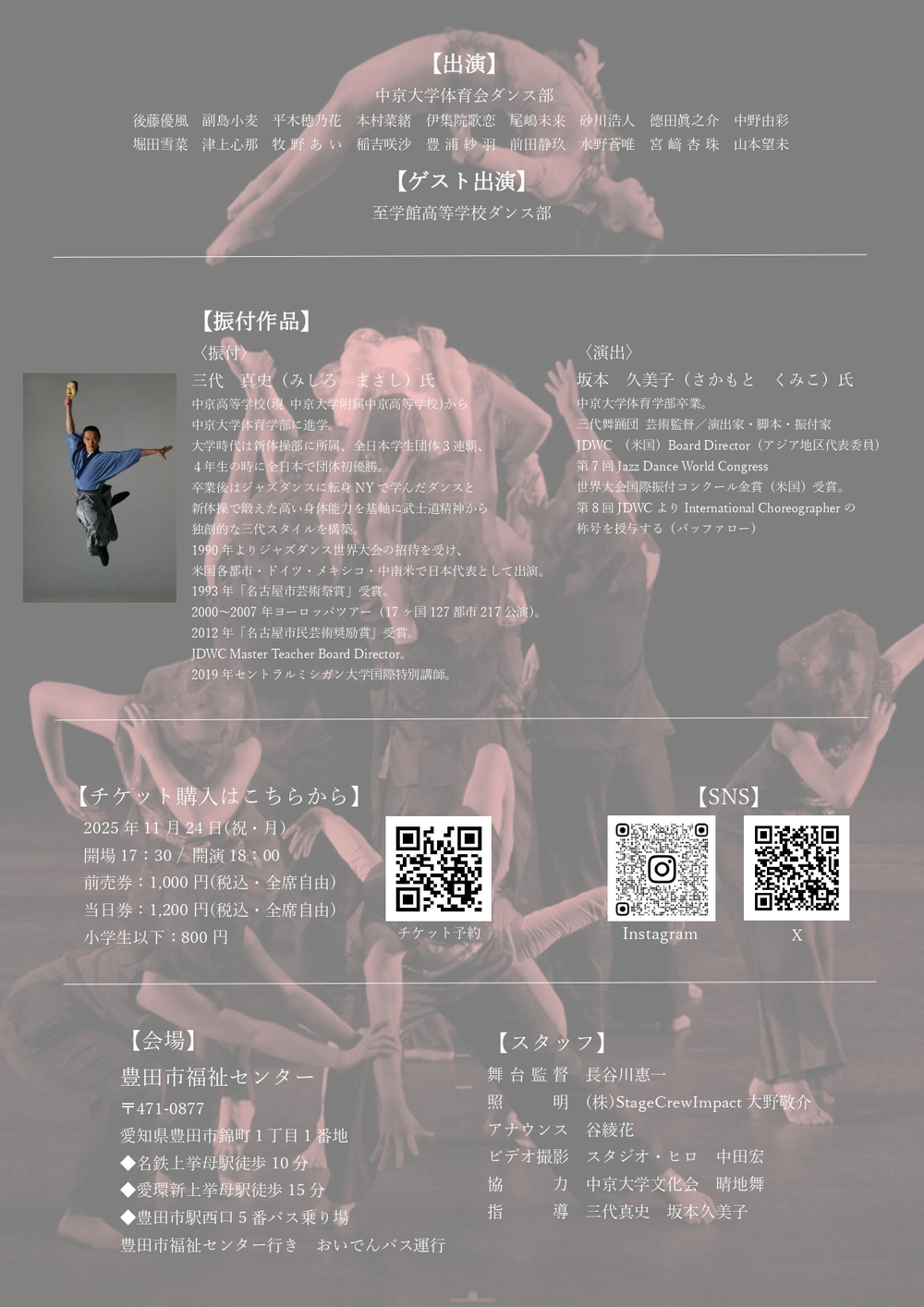 今回の自主公演では、第37回全日本高校・大学ダンスフェスティバル(神戸)にて入選した作品「教皇選挙(コンクラーベ)」をはじめ、S.C.D.C.in金沢2025受賞作品(審査員賞2位)、第28回ART.M(少人数による創作ダンスコンクール)出場作品等を上演する予定です!さらに、至学館高等学校ダンス部によるゲスト作品や、ジャズダンサーとして世界で活躍する三代真史先生による特別振付作品など内容盛り沢山となっております!
