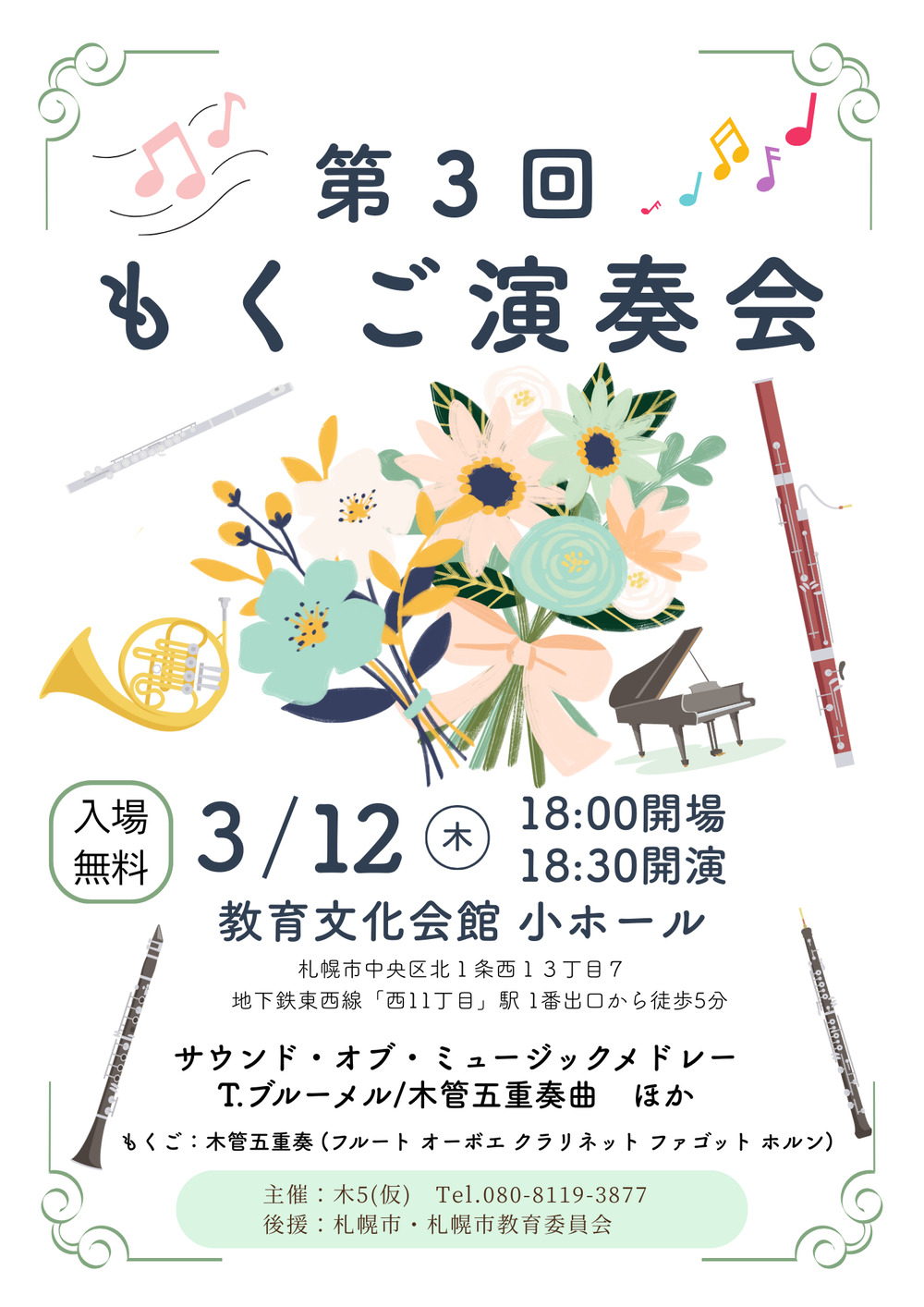 木管五重奏はフルート、オーボエ、クラリネット、ファゴット、ホルンで構成されます。音色の異なる楽器が織りなす、あたたかいハーモニーとアンサンブルが魅力です。はじめてでも聞きやすいクラシック曲と、耳馴染みのあるメロディーをたくさん盛り込んだプログラムです。お気軽にお越しください!
