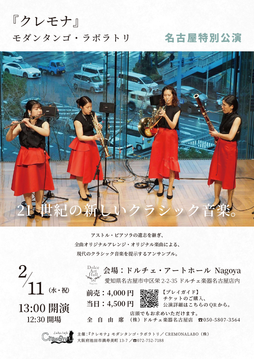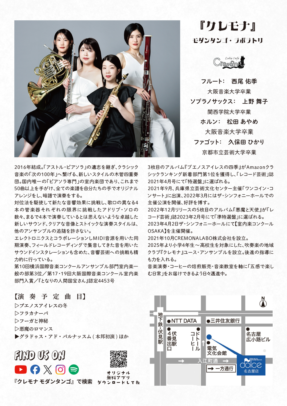 クレモナは、タンゴをルーツに持ちながら、現代音楽や即興の要素を融合させた木管アンサンブルです。
