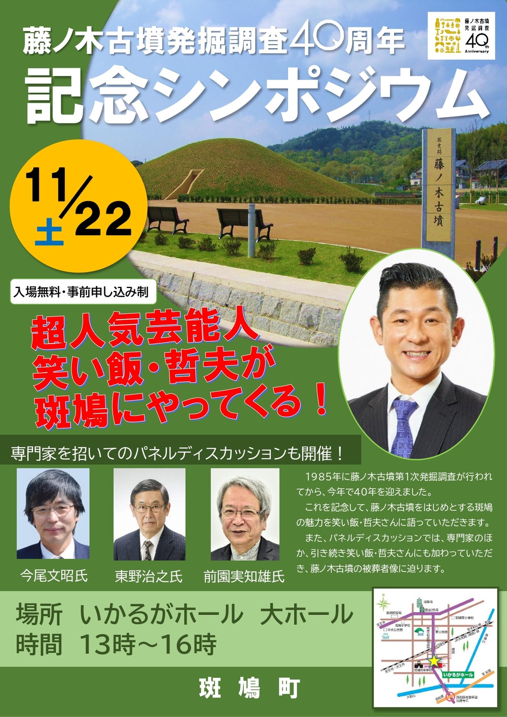藤ノ木古墳発掘調査40周年記念シンポジウムでは、仏像や寺院など仏教美術に造けいの深い、笑い飯の哲夫さんをお招きし、藤ノ木古墳をはじめとする斑鳩町の魅力について熱く語っていただきます。また、歴史や考古学の専門家をお招きし、藤ノ木古墳の被葬者について議論を交わしていただきます。