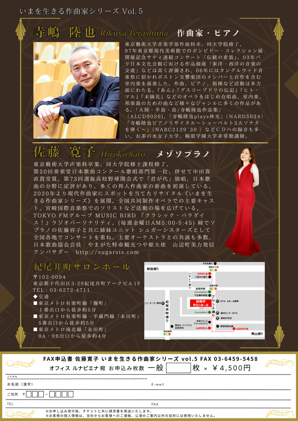 メゾソプラノ佐藤寛子によるコンサートシリーズ。現代作曲家一人にスポットを当て、作品の魅力を探る。第5回目となる本年は多岐にわたり活躍する寺嶋陸也の歌曲作品を取り上げ、作曲家自身によるピアノ伴奏で濃密なアンサンブルを展開する。