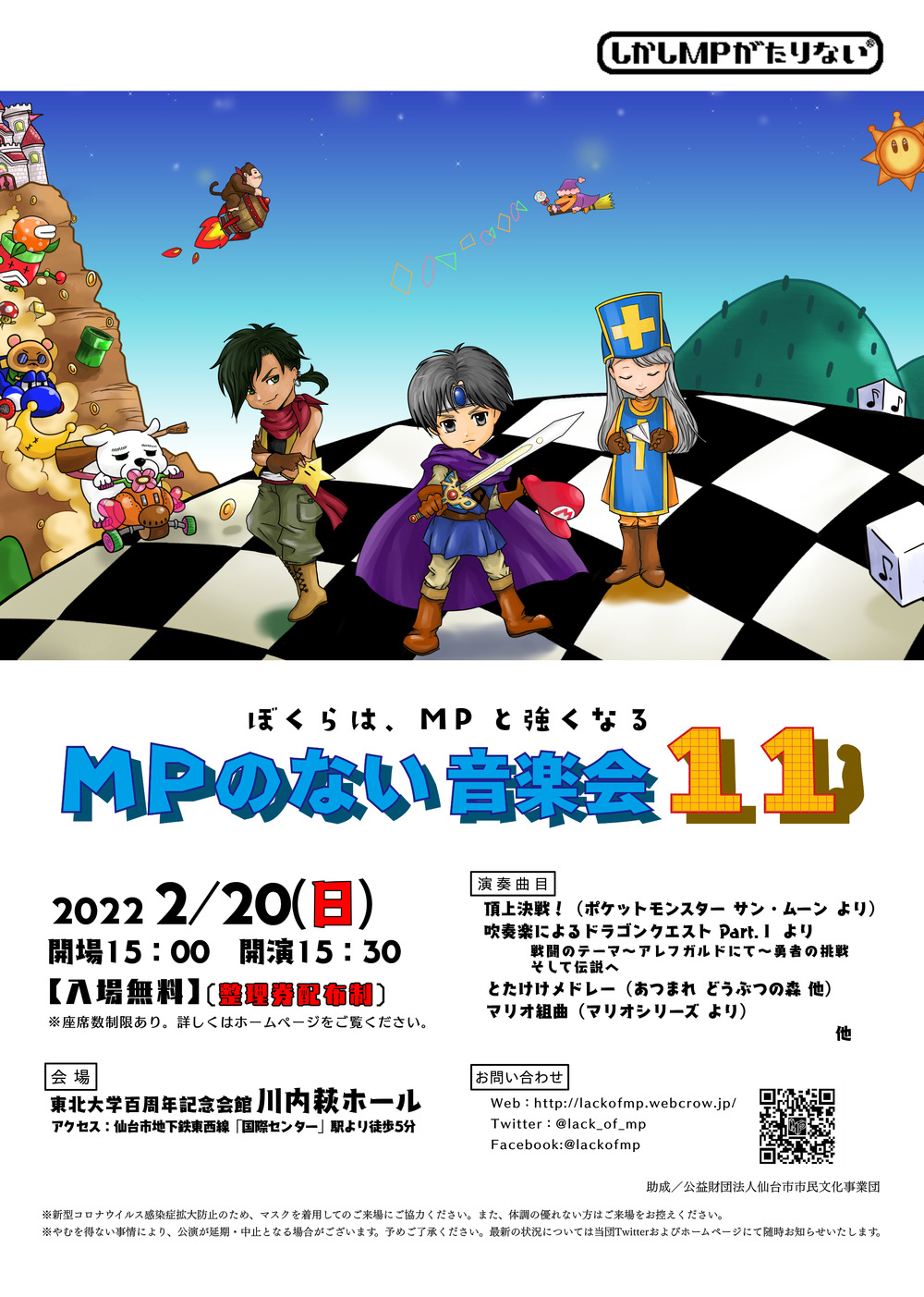 仙台を中心に活動するゲーム音楽吹奏楽団です! 【出演】定期演奏会「MPのない音楽会」、定禅寺ストリートジャズフェスティバル、市民センター等での各種イベント…