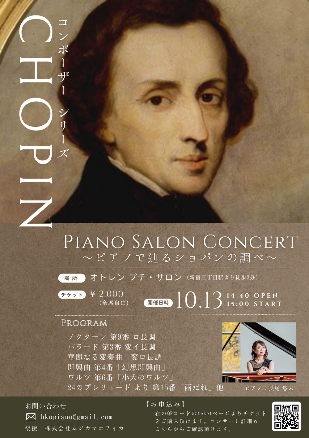 ショパンの名曲を中心に、解説を交えながら演奏をお届けします。ショパン好きな方は勿論、あまりショパンを知らない方もお楽しみ頂けるプログラムになっていると思います。