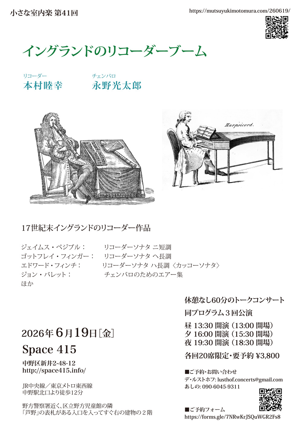中野のSpace 415で、トークを含め、休憩なし60分のプログラムを1日3公演行う「小さな室内楽」。40席中20席限定で、お客様ひとりひとりと演奏者が挨拶を交わせる社交の場となるようなサロンコンサートです。 41回目となる今回は、17世紀末イングランドの作品を取り上げます。17世紀末には、3本の管を繋いで上部が太く下部が細い、現在の形のリコーダーが誕生し、以降リコーダーの作品がたくさん書かれるようになります。特にイングランドでは、フランスから渡ってきた名手ペジブルが一世を風靡する大スターとなり、ともにフランスから移住してきた製作家のブレッサンも数々の名器を作り始めるなど、大きなブームが起こっていました。リコーダーレパートリーの原点ともいえるその頃の作品をお楽しみください。また、今回共演をお願いした永野光太郎さんとは、バロックリコーダーの作品を動画で収録していくプロジェクトを今年から始めています。その第1弾はフィンガーの作品でした。今回の取り上げる曲とは異なり、演奏場所も違いますが、動画も埋め込んでおきます。このような演奏を動画と同じように間近でお聴きいただくコンサートです。少人数のお客様と演奏者で音楽を共有する場を楽しみましょう。