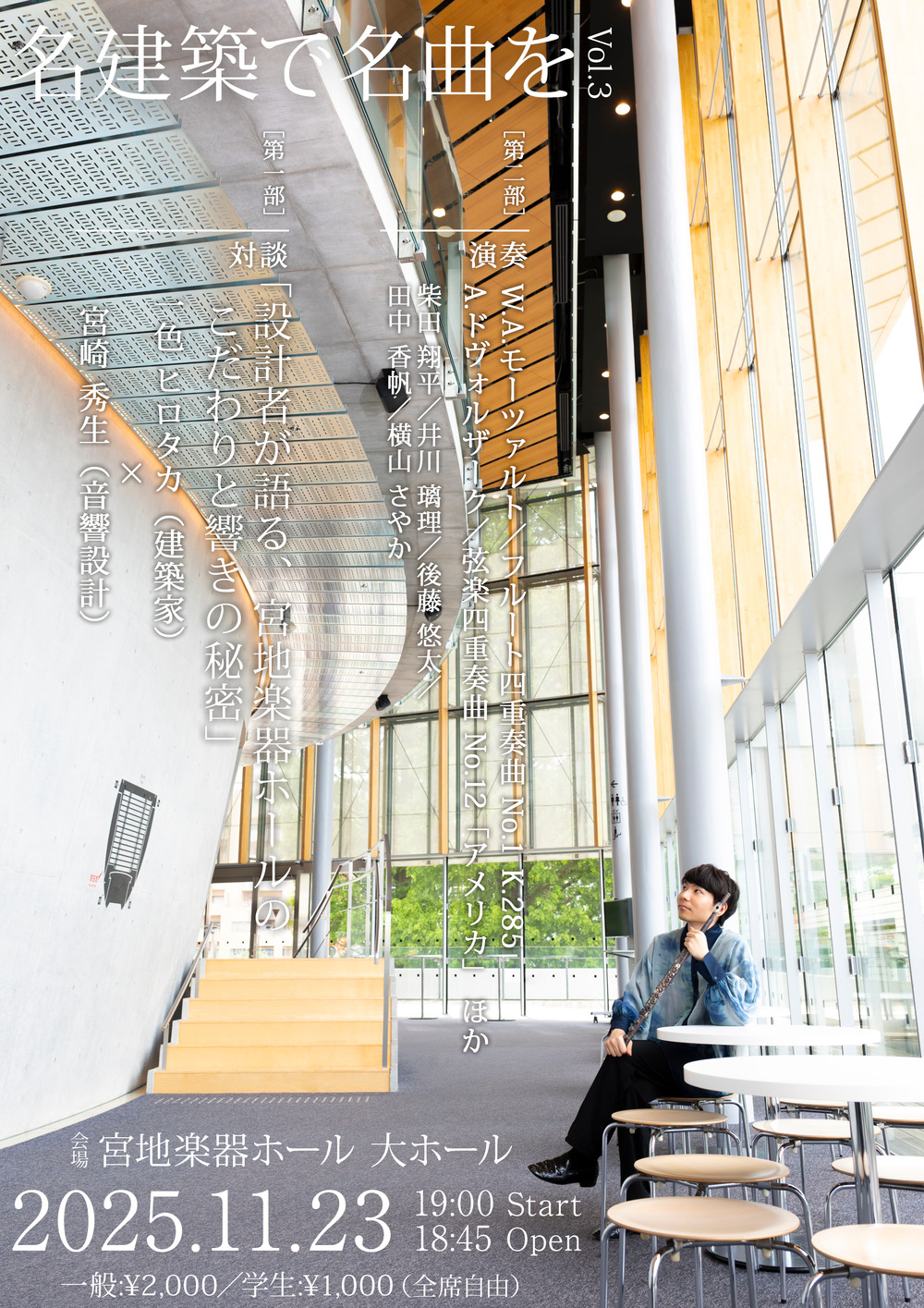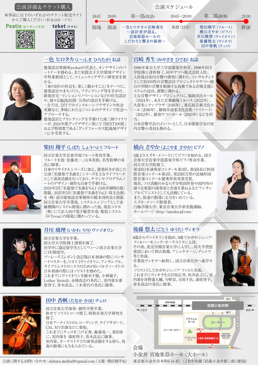 現在も建築の最前線で活躍されるお2人による対談と、そのこだわりの響きをじっくりと味わうコンサートが一体となった、贅沢な時間をお楽しみください。