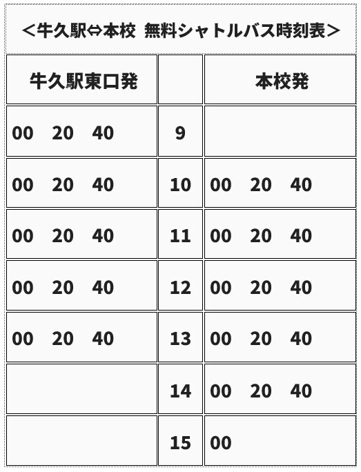🚌 無料シャトルバスを牛久駅~本校で約20分間隔運行予定。