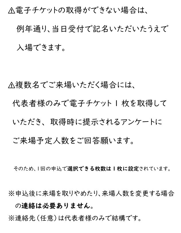 ⚠電子チケットの取得ができない場合は、例年通り、当日に受付にて記名いただいたうえで入場できます。