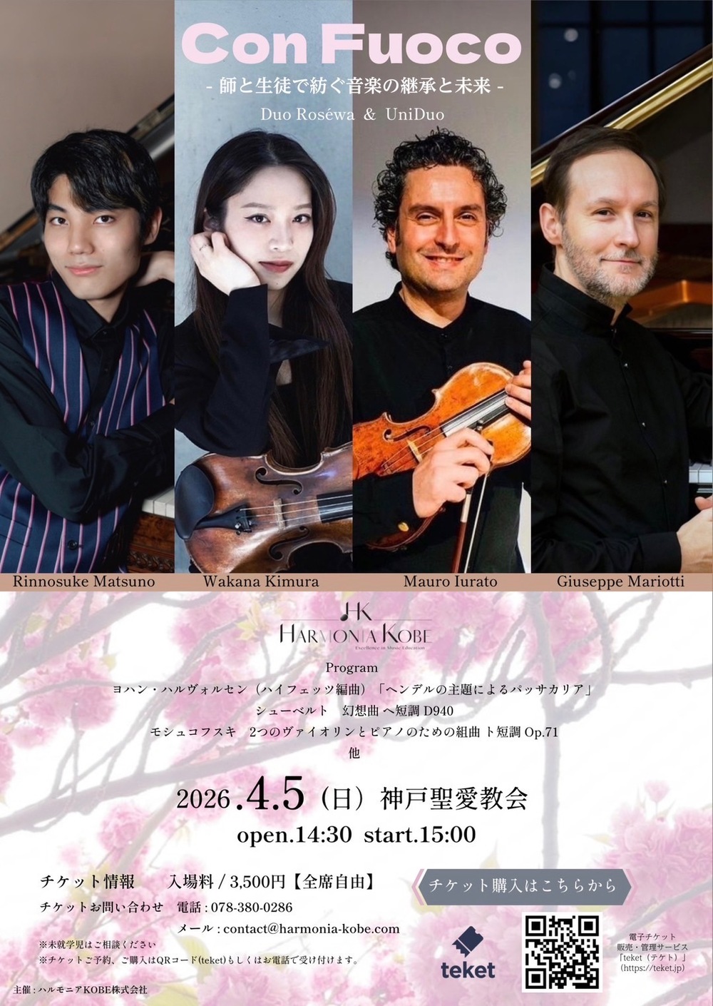 日本で活躍する二人のイタリア人音楽家、名門ウィーン国立音楽大学で学ぶそれぞれの愛弟子がウィーンでデュオを結成。国際音楽コンクールで賞歴を重ねる来日中の二人と日本で活躍する恩師が奏でる特別な演奏会。