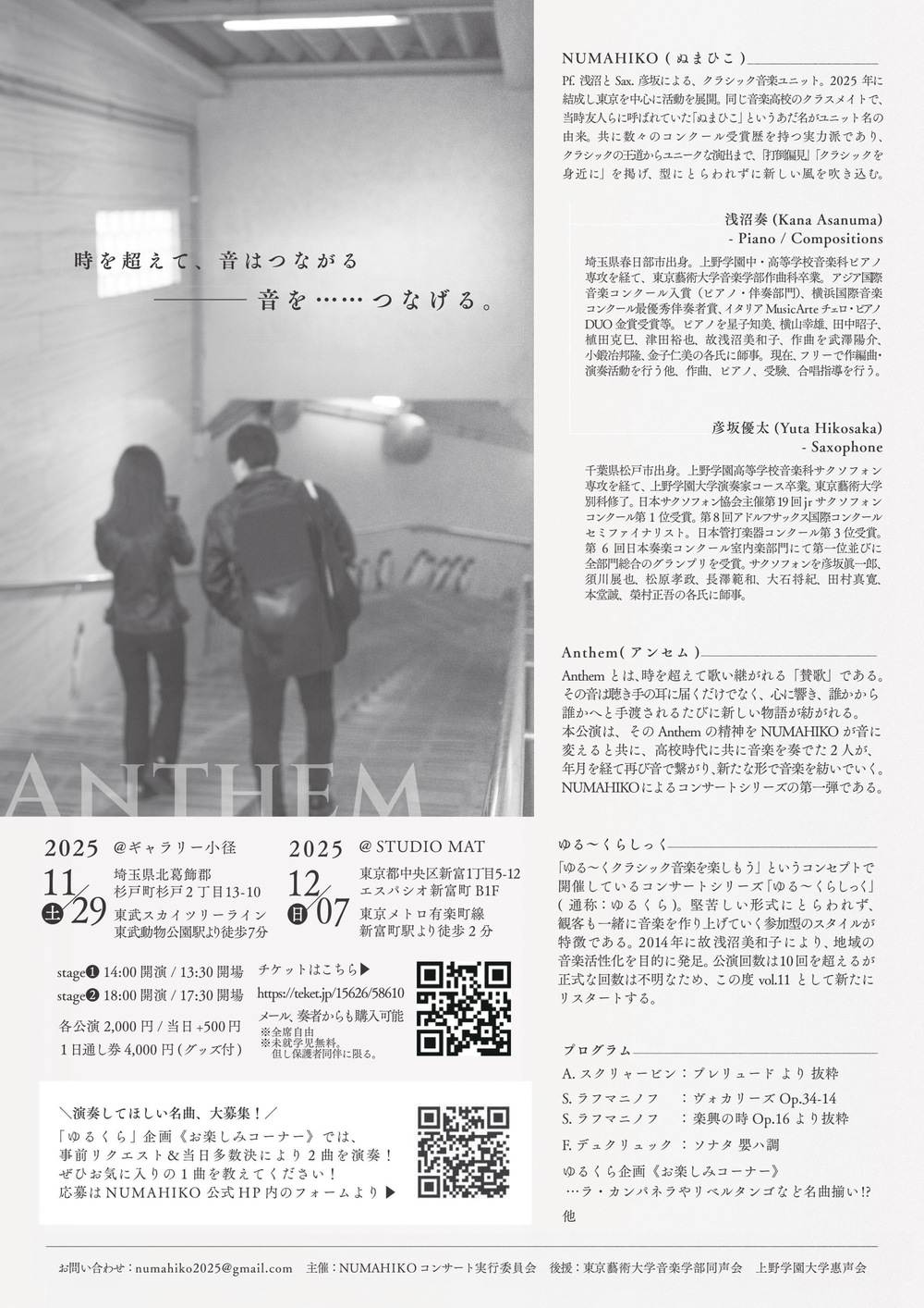 サックス×ピアノによるクラシック音楽ユニット、NUMAHIKOが贈るコンサートシリーズ第1弾《Anthem》。