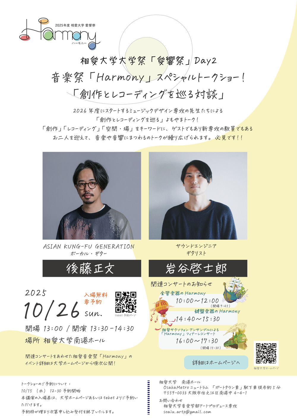「創作」「レコーディング」「空間・場」をキーワードに、ASIAN KUNG-FU GENERATION ボーカル/ギター 後藤正文氏 と エンジニア/ギタリスト 岩谷啓士郎 氏をゲストにお迎えし、音楽や音響にまつわるトークを繰り広げます。必見です!!