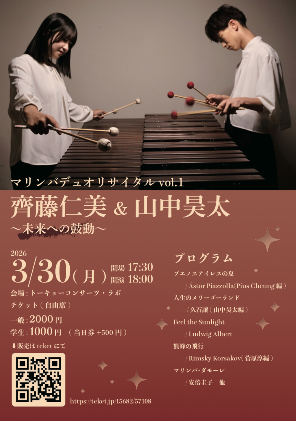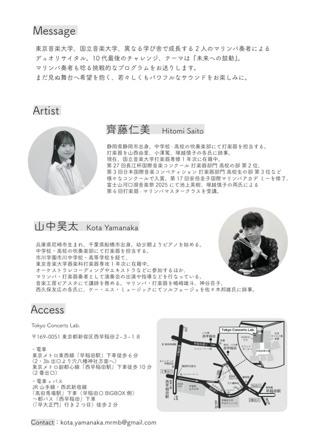 国立音楽大学と東京音楽大学、普段異なる環境で研鑽を積む2人の音。混ざり合い、新たなハーモニーを生む瞬間にお立ち会いいただければと思います。