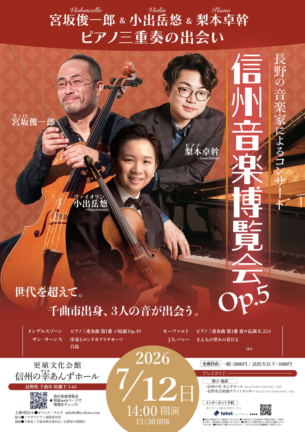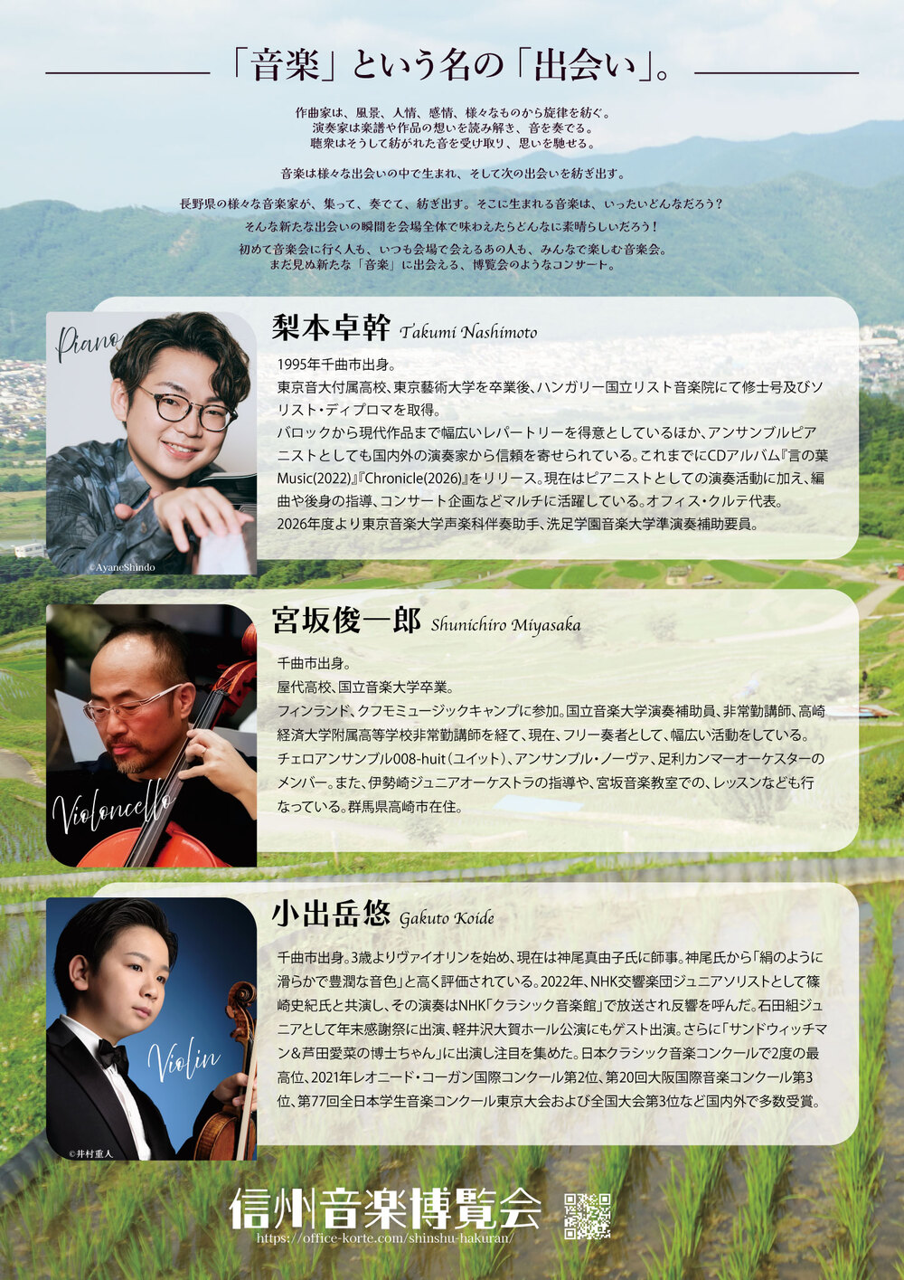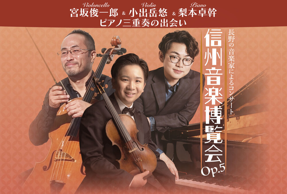 第5回公演には、チェロ奏者の宮坂俊一郎、ピアニストの梨本卓幹、ヴァイオリンの小出岳悠の3人が登場!千曲市出身の3人組による音楽をどうぞお楽しみに!