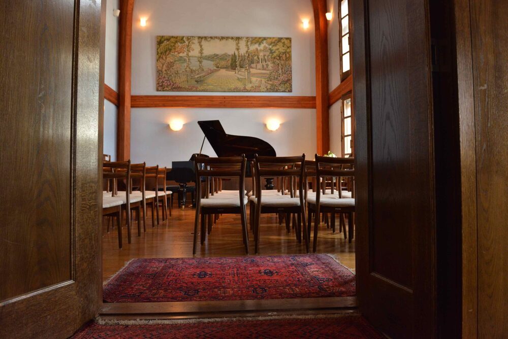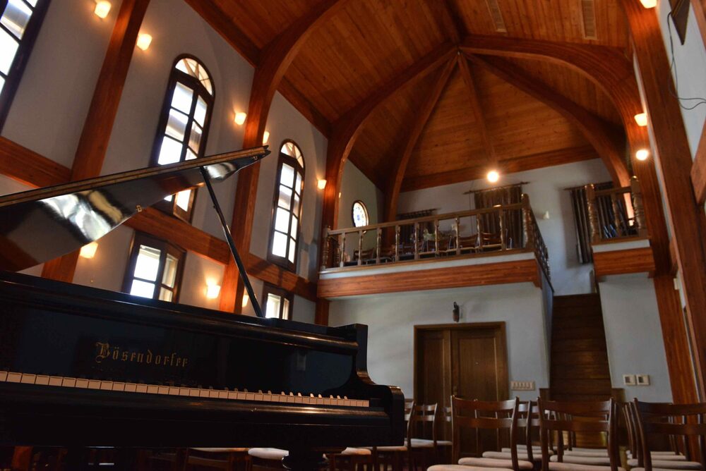 木造の柱が高さ7mの天井に向ってアーチ状に組まれ、ホールに1歩入ると、そこはまるでヨーロッパの小さな教会。 この70席の小さなホールで、聴衆は天井から降り注ぐ響きと共に、演奏者の表情・息遣いさえ感じ、まさに演奏者と一体になれる空間です。