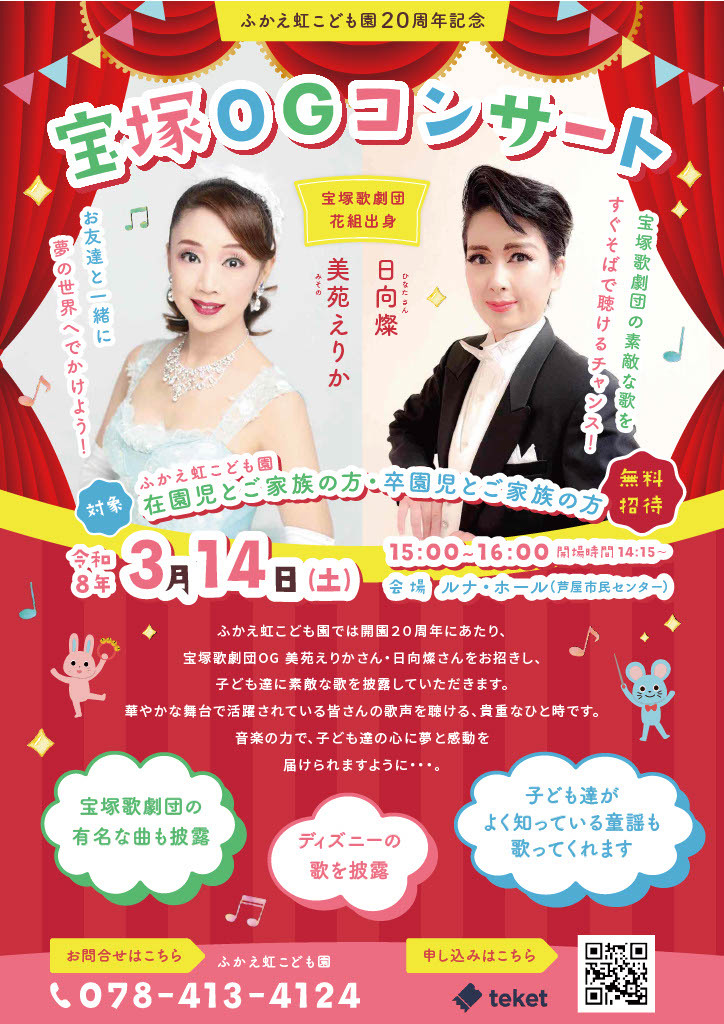 ふかえ虹こども園では開園20周年にあたり、宝塚歌劇団OG 美苑えりかさん・日向燦さんをお招きし、子ども達に素敵な歌を披露していただきます。