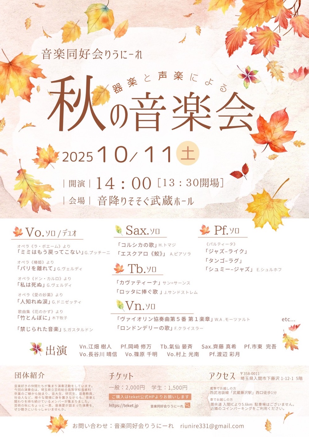芸術の秋にちょっと一息、音楽愛が詰まった演奏を、ぜひ聴きにいらっしゃいませんか。