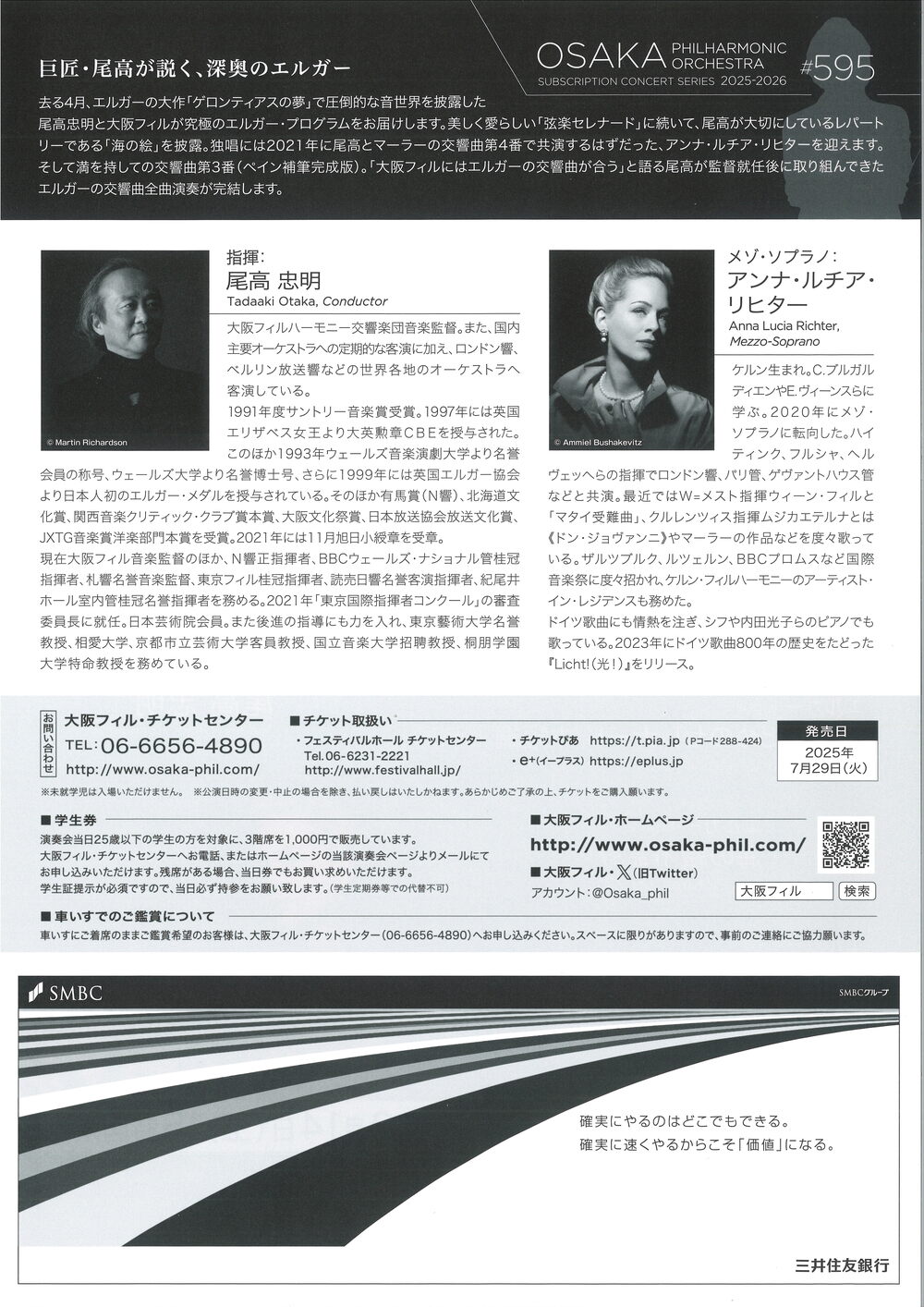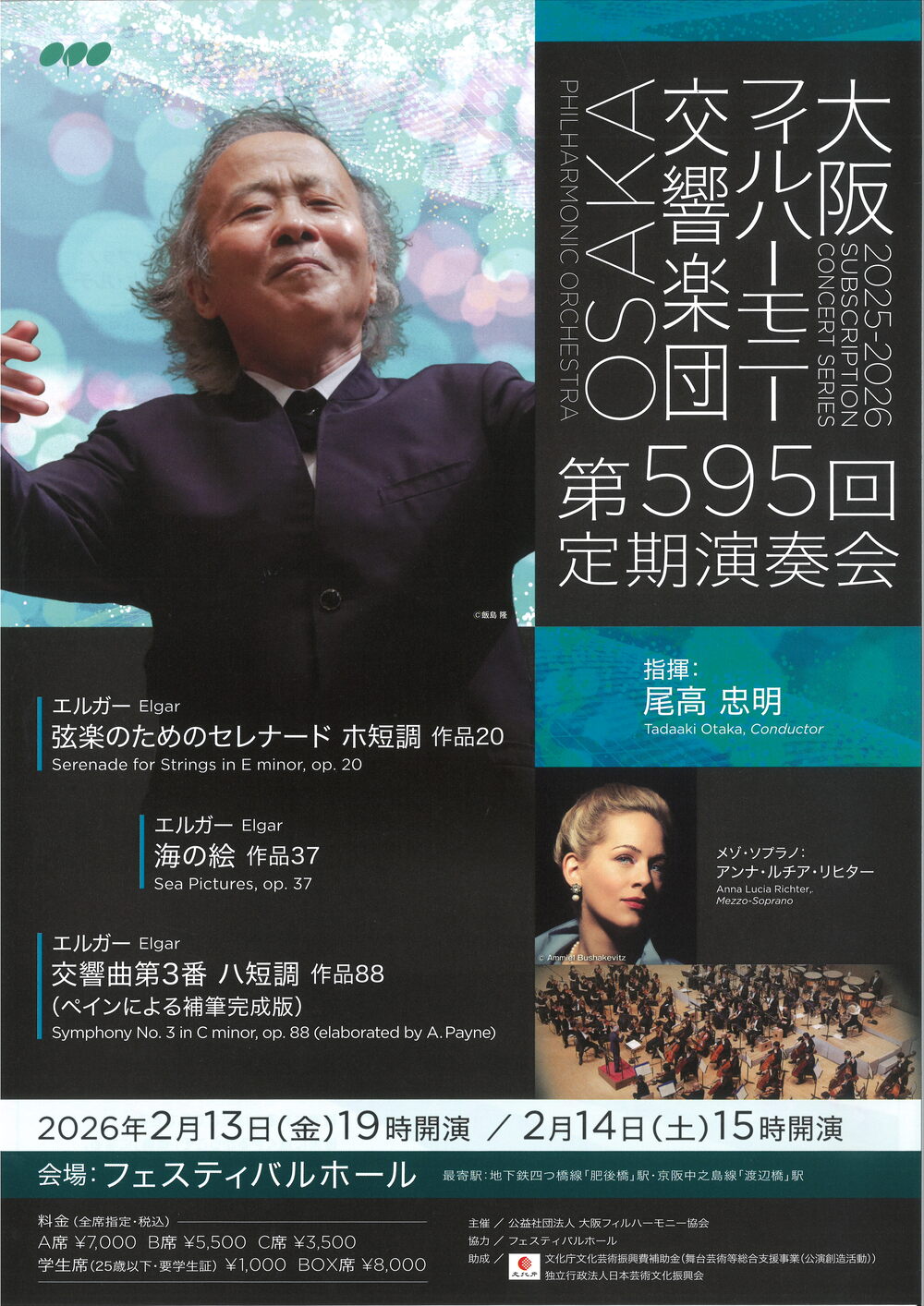 去る4月、エルガーの大作「ゲロンティアスの夢」で圧倒的な音世界を披露した尾高忠明と大阪フィルが究極のエルガー・プログラムをお届けします。美しく愛らしい「弦楽セレナード」に続いて、尾高が大切にしているレパートリーである「海の絵」を披露。独唱には2021年に尾高とマーラーの交響曲第4番で共演するはずだった、アンナ・ルチア・リヒターを迎えます。そして満を持しての交響曲第3番(ペイン補筆完成版)。「大阪フィルにはエルガーの交響曲が合う」と語る尾高が監督就任後に取り組んできたエルガーの交響曲全曲演奏が完結します。