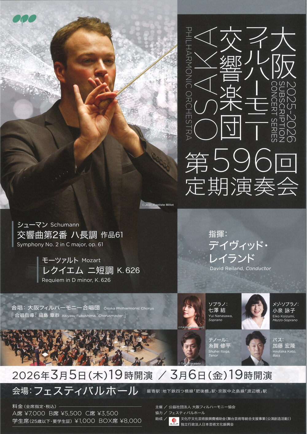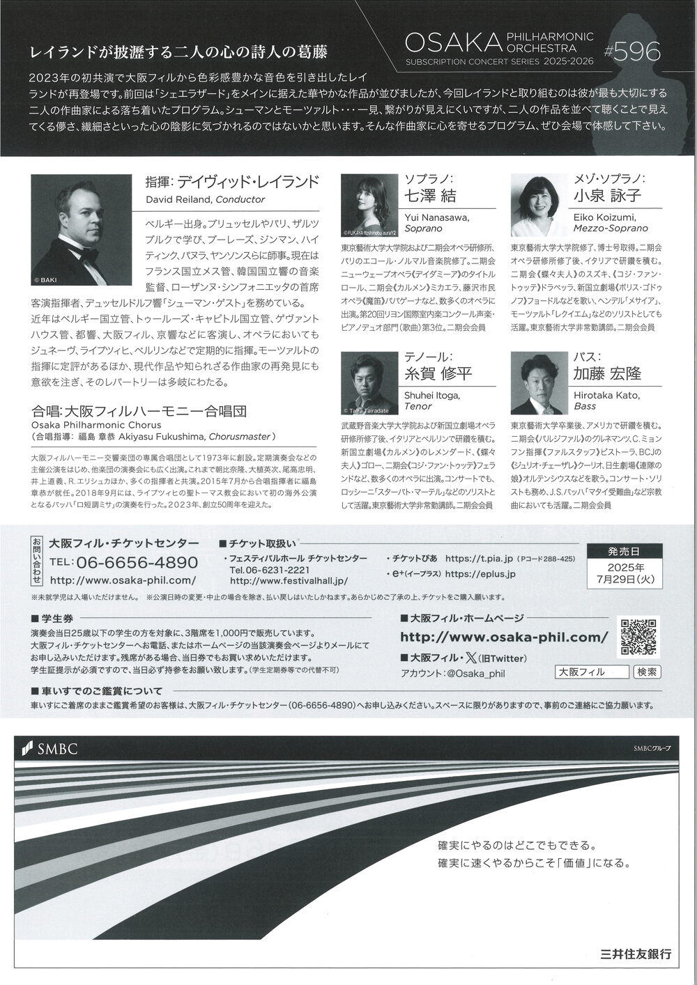2023年の初共演で大阪フィルから色彩豊かな音色を引き出したレイランドが再登場です。前回は「シェエラザード」をメインに据えた華やかな作品が並びましたが、今回レイランドと取り組むのは彼が最も大切にする二人の作曲家による落ち着いたプログラム。シューマンとモーツァルト・・・一見、繋がりが見えにくいですが、二人の作品を並べて聴くことで見えてくる儚さ、繊細さといった心の陰影に気づかれるのではないかと思います。そんな作曲家に心を寄せるプログラム、ぜひ会場で体感してください。