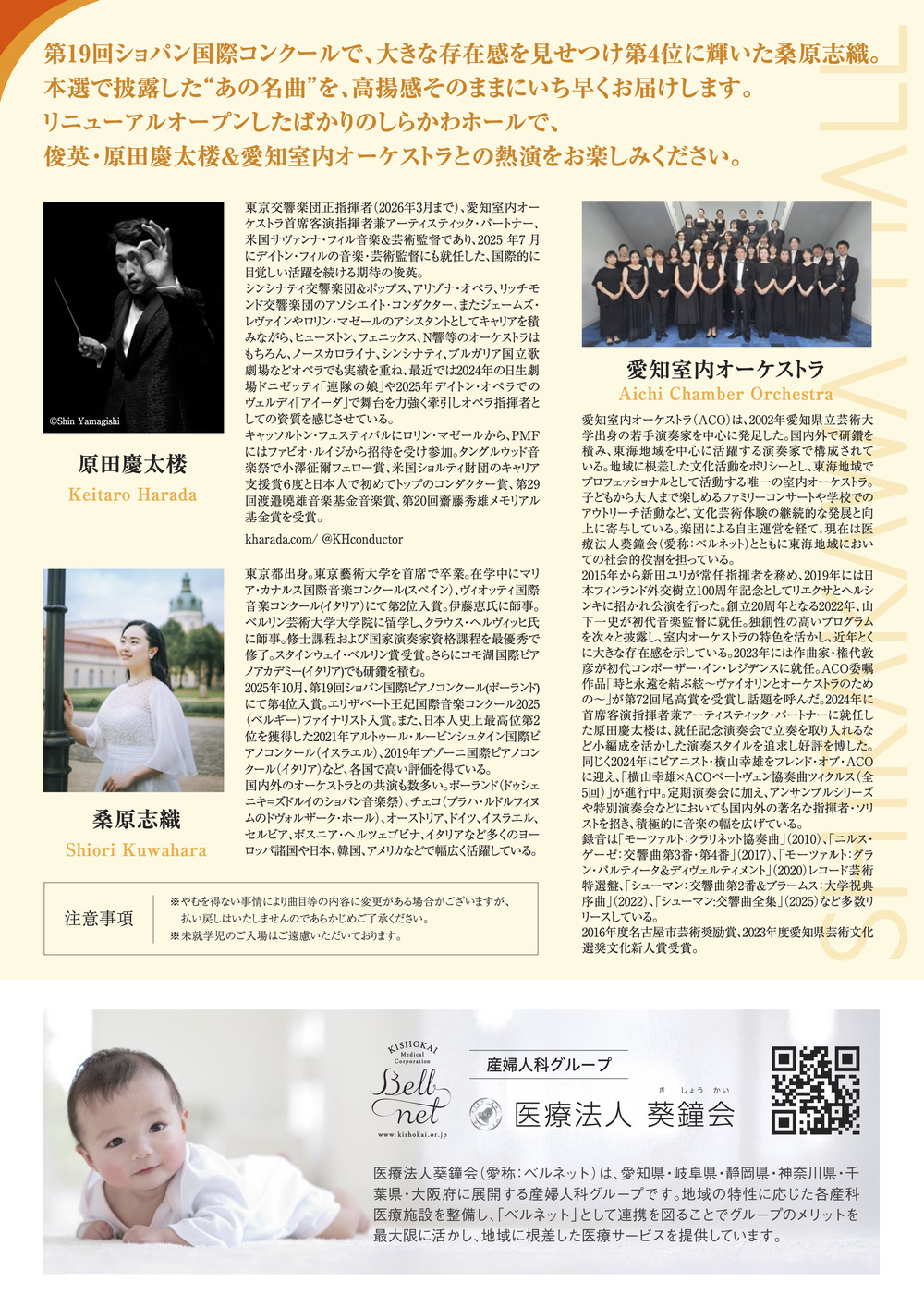 第19回ショパン国際コンクールで、大きな存在感を見せつけ第4位に輝いた桑原志織。本選で披露した“あの名曲”を、高揚感そのままにいち早くお届けします。リニューアルオープンしたばかりのしらかわホールで、俊英・原田慶太楼&愛知室内オーケストラとの熱演をお楽しみください。