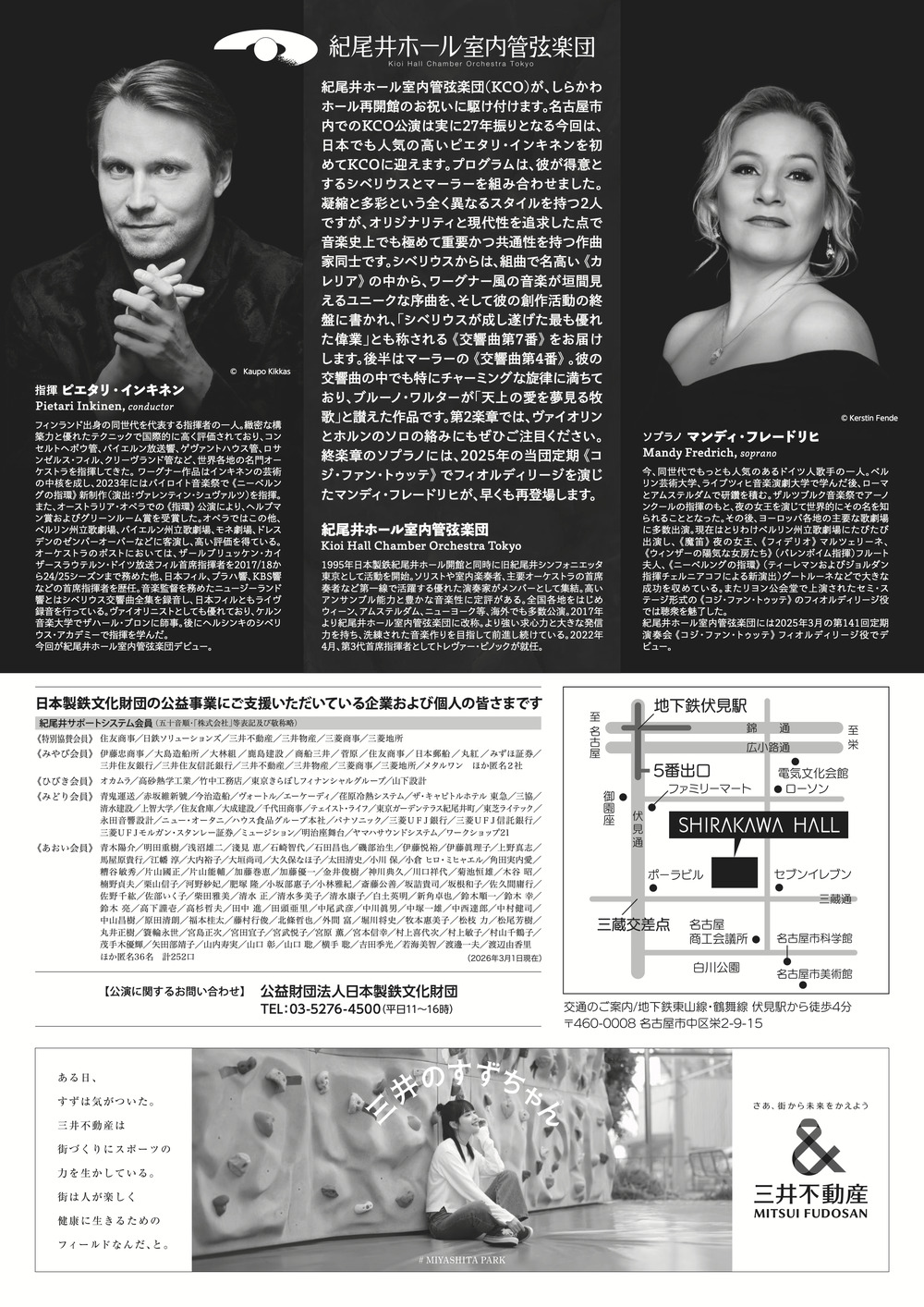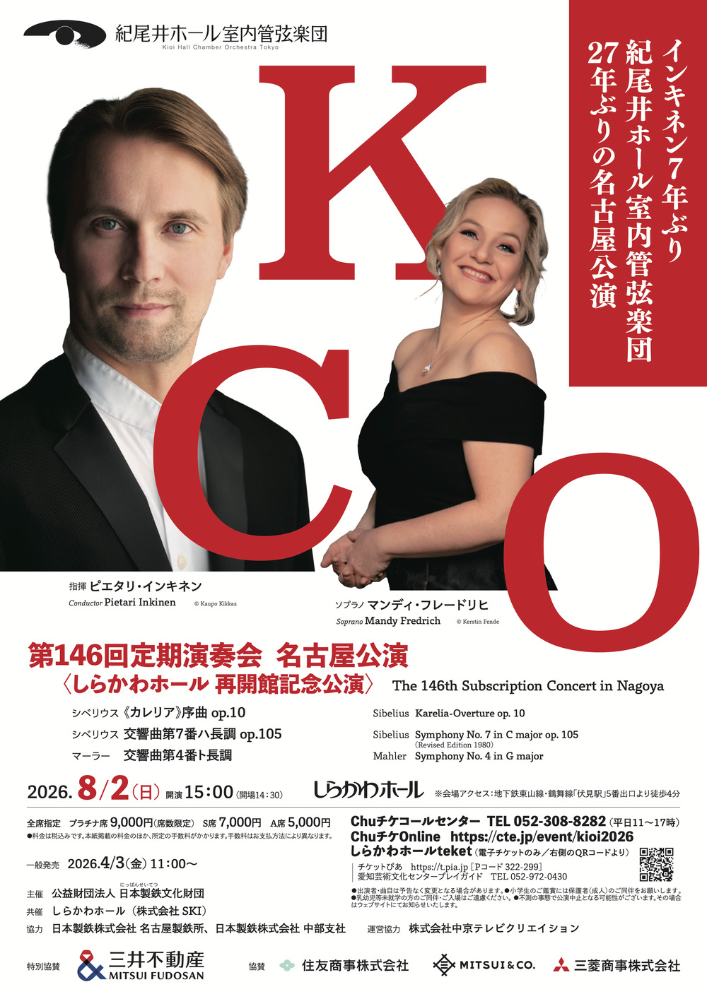 しらかわホールの再開館を祝し、紀尾井ホール室内管弦楽団(KCO)が27年ぶりに名古屋に登場します。主要オケの首席奏者や名ソリストが集うKCOは、国内屈指の優れたオーケストラとして知られます。指揮は、フィンランド出身の旗手、ピエタリ・インキネン。バイロイト音楽祭等で国際的な評価を確立した彼が、得意とするシベリウスとマーラーを披露します。さらに、ヨーロッパの名門歌劇場で活躍するソプラノ、マンディ・フレードリヒも名古屋初登場。精鋭たちが紡ぐ極上のアンサンブルにご期待ください。