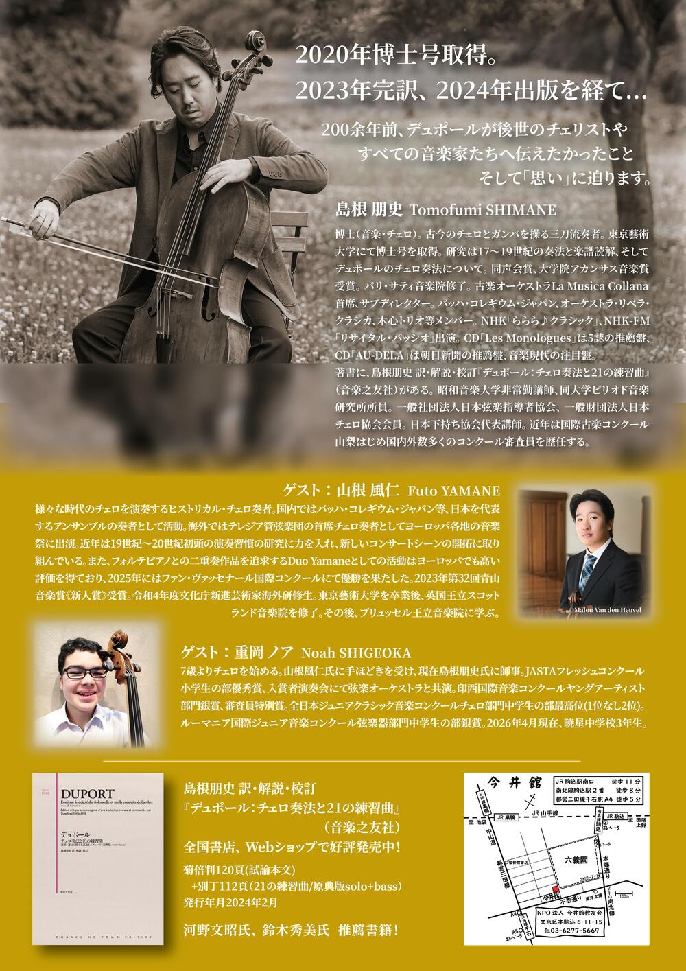 『デュポール:チェロ奏法と21の練習曲』(音楽之友社)の 訳・解説・校訂者 である 島根朋史 による、本の解説と演奏を楽しむ公演 第4弾 です。